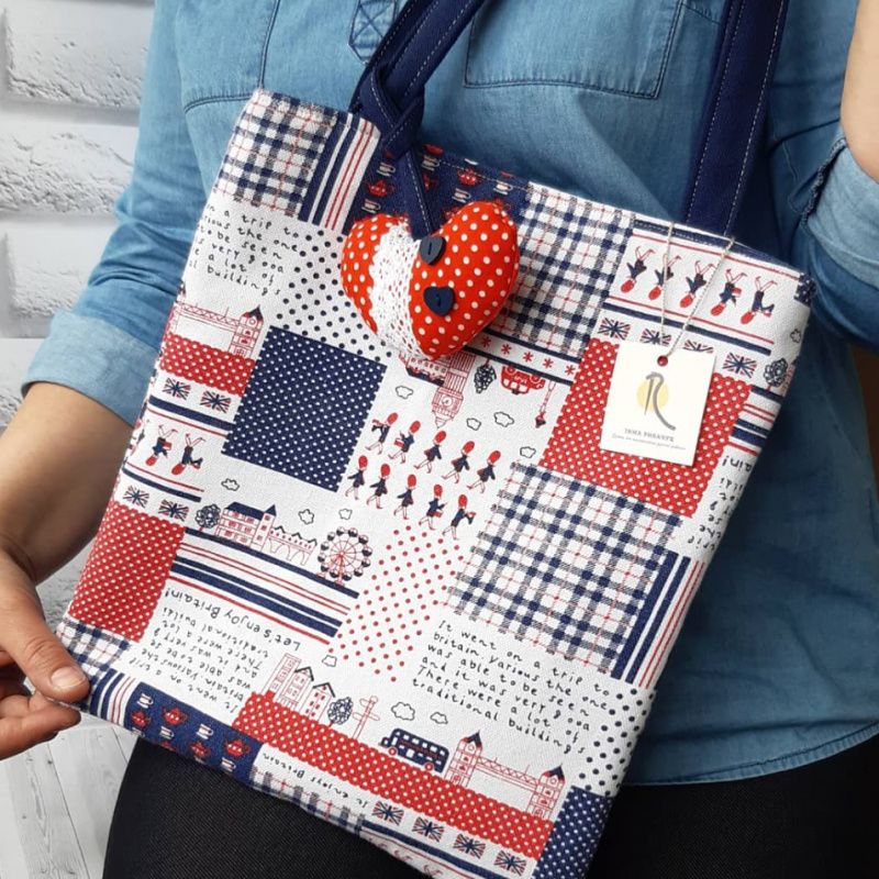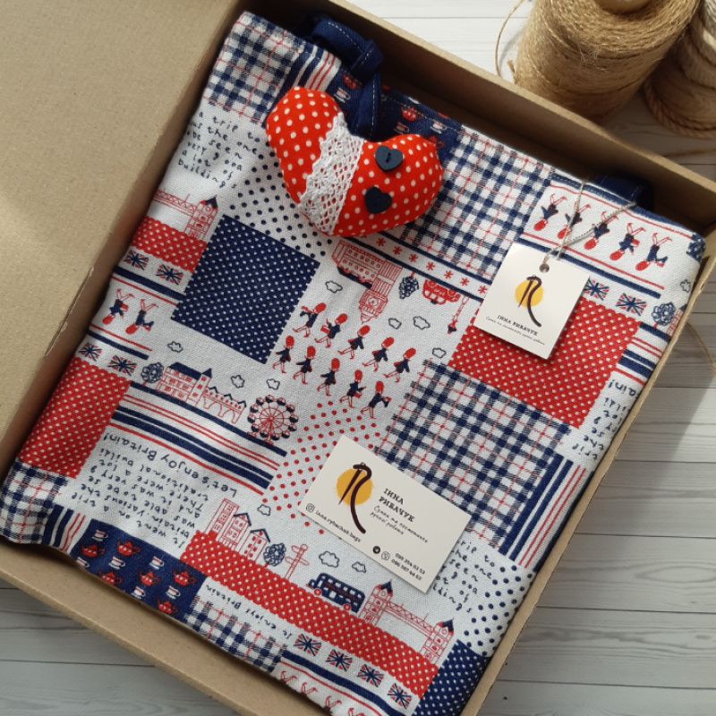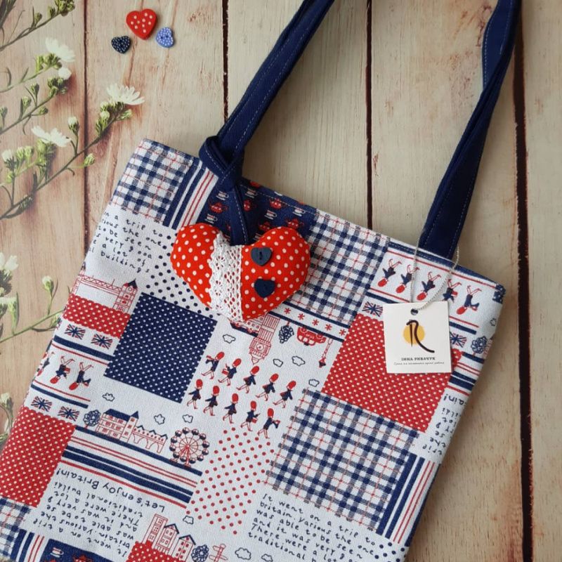 Небольшая, но вмиститка сумка для прогулок или покупок "Лондон". Сшита из деко-хлопка, подкладка лен, плотная Дублерин. Дополнительный аксессуар-сердце из яркой ткани (внутри синтепон), украшенный натуральным кружевом и деревянными пуговицами-сердцами Застегивается на блискпвку, внутри небольшая накладной карман. Размер-30 × 32 см, длина ручек-56см. Высылается в подаоунковий крафтоаий коробке