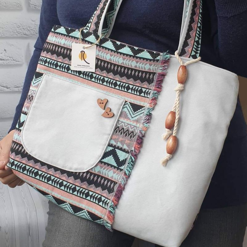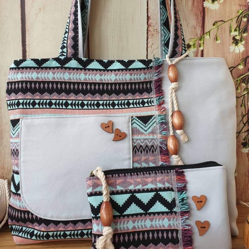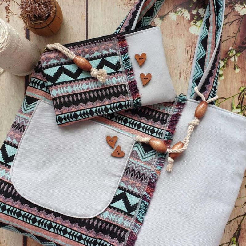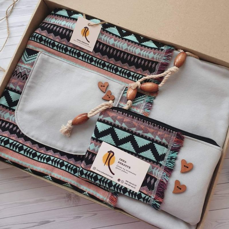 Еще одна сумка в этно-стиле -для тех, кто любит уютные и тактильные вещи, сделанные своими руками Сумка сшита из гобелена и саржи. Застегивается на молнию, внутри два накладных кармана. Большую накладную карман на магнитной кнопке украшают деревянные пуговицы-сердца. В дополнение к сумке - косметичка на молнии (внутри два кармашка для мелочей). Можно использовать для шопинга, прогулок и как пляжный вариант. Высылается в подарочной крафтовой коробке. Размер сумки-43 × 34 см, длина ручек-52 см. Косметичка-21 × 14 см.
