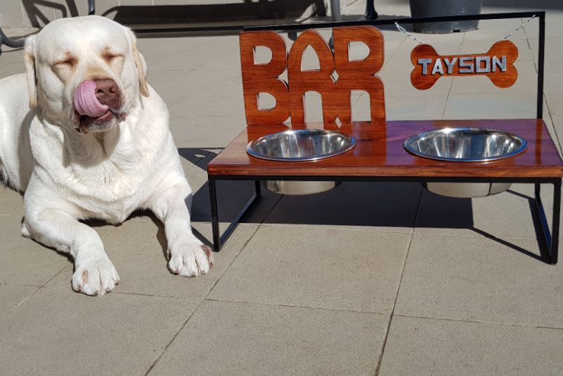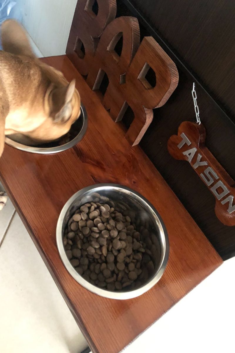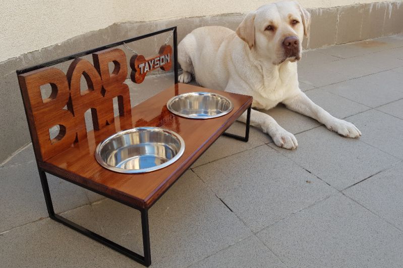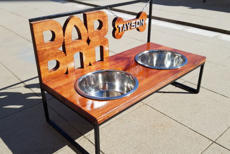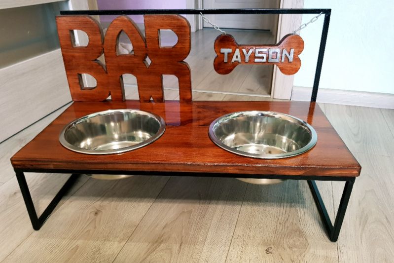 Именная подставка "Бар" с мисками для вашего любимца ручной работы с индивидуальным дизайном Подставка изготавливается под заказ с учетом ваших пожеланий и размеров вашего любимца, чтобы ее использование было максимально комфортным для него. Также есть возможность учета ваших пожеланий по выбору цвета изделия, чтобы он максимально сочетался с вашим интерьером и оставался уникальным. Подставка изготавливается из высококачественной древесины и металла, с использованием элементов из цветных металлов и или эпоксидной смолы для создания уникального дизайна (соглашается дополнительно) В комплект входит 2 миски из нержавеющей стали. Объе может быть отдельно согласован под ваши нужды. Данный вариант хорошо подойдет для собак средних пород и кошек.