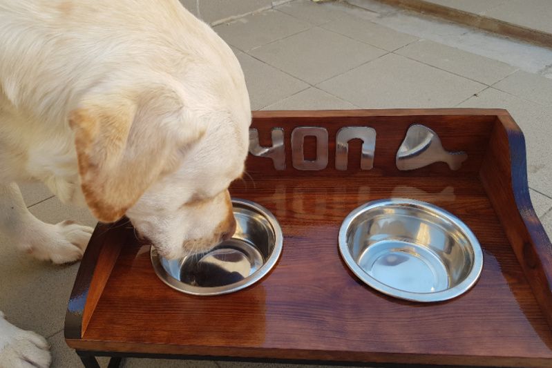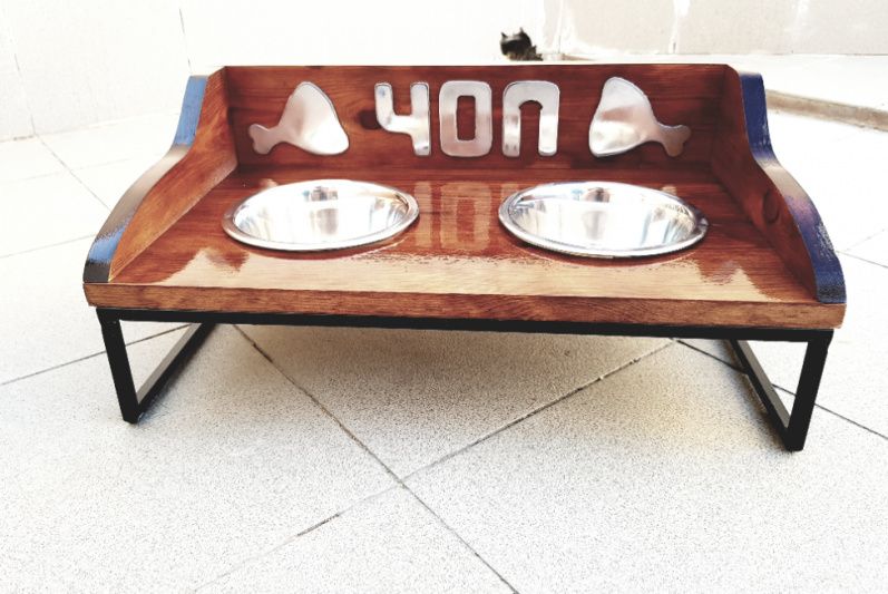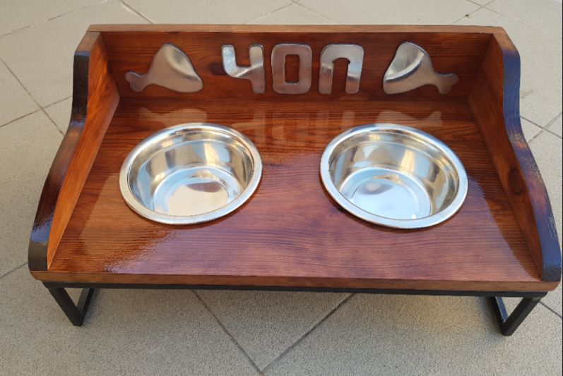 Именная подставка "Комфорт" с мисками для вашего любимца ручной работы с индивидуальным дизайном Подставка изготавливается под заказ с учетом ваших пожеланий и размеров вашего любимца, чтобы ее использование было максимально комфортным для него. Также есть возможность учета ваших пожеланий по выбору цвета изделия, чтобы он максимально сочетался с вашим интерьером и оставался уникальным. Специальные бортики предотвращают разлива воды и разбрасывания пищи, таким образом место для кормления остается чистым. Подставка изготавливается из высококачественной древесины и металла, с использованием элементов из цветных металлов или эпоксидной смолы для создания уникального дизайна (согласовывается дополнительно). В комплект входит две миски из нержавеющей стали. Объе может быть отдельно согласован под ваши нужды. Данный вариант хорошо подойдет для собак средних пород и кошек