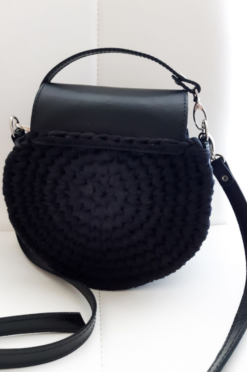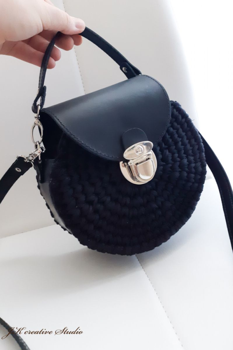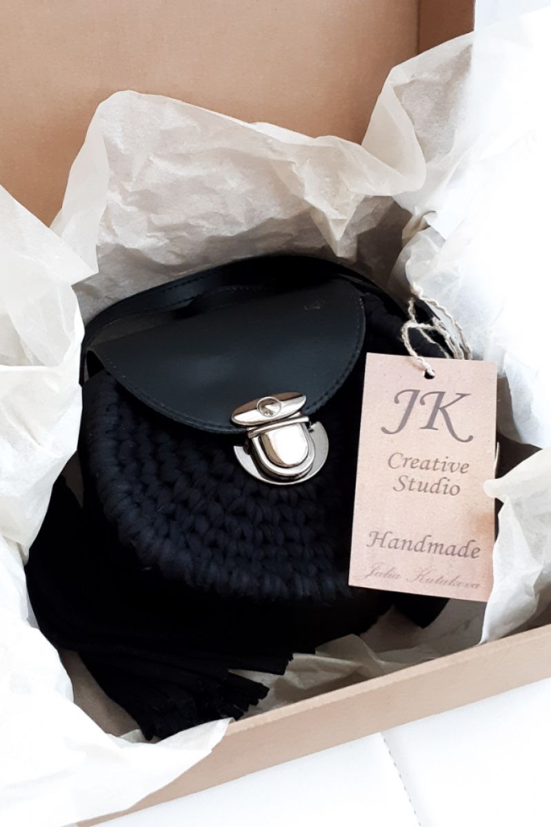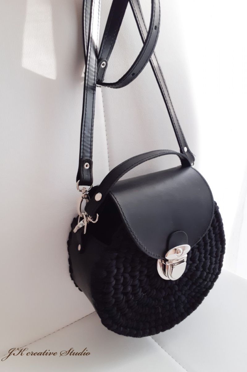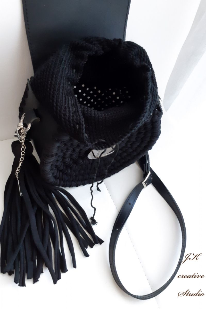 Круглая сумочка в стиле бохо из трикотажной пряжи с вставками из натуральной кожи.