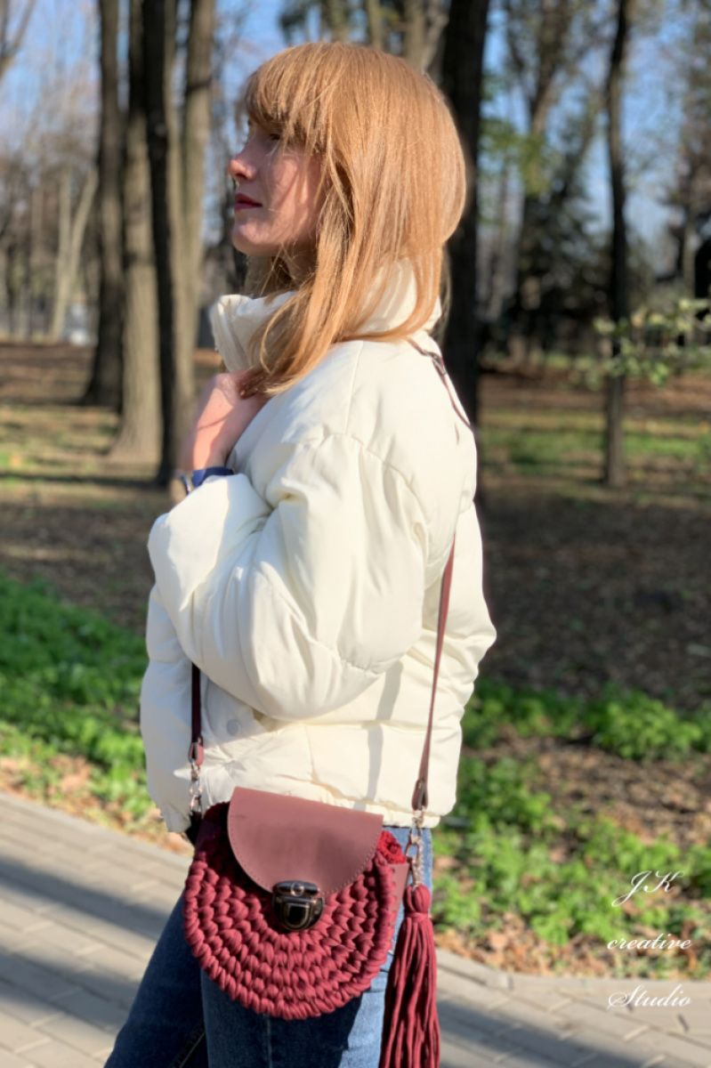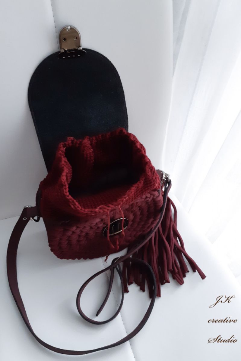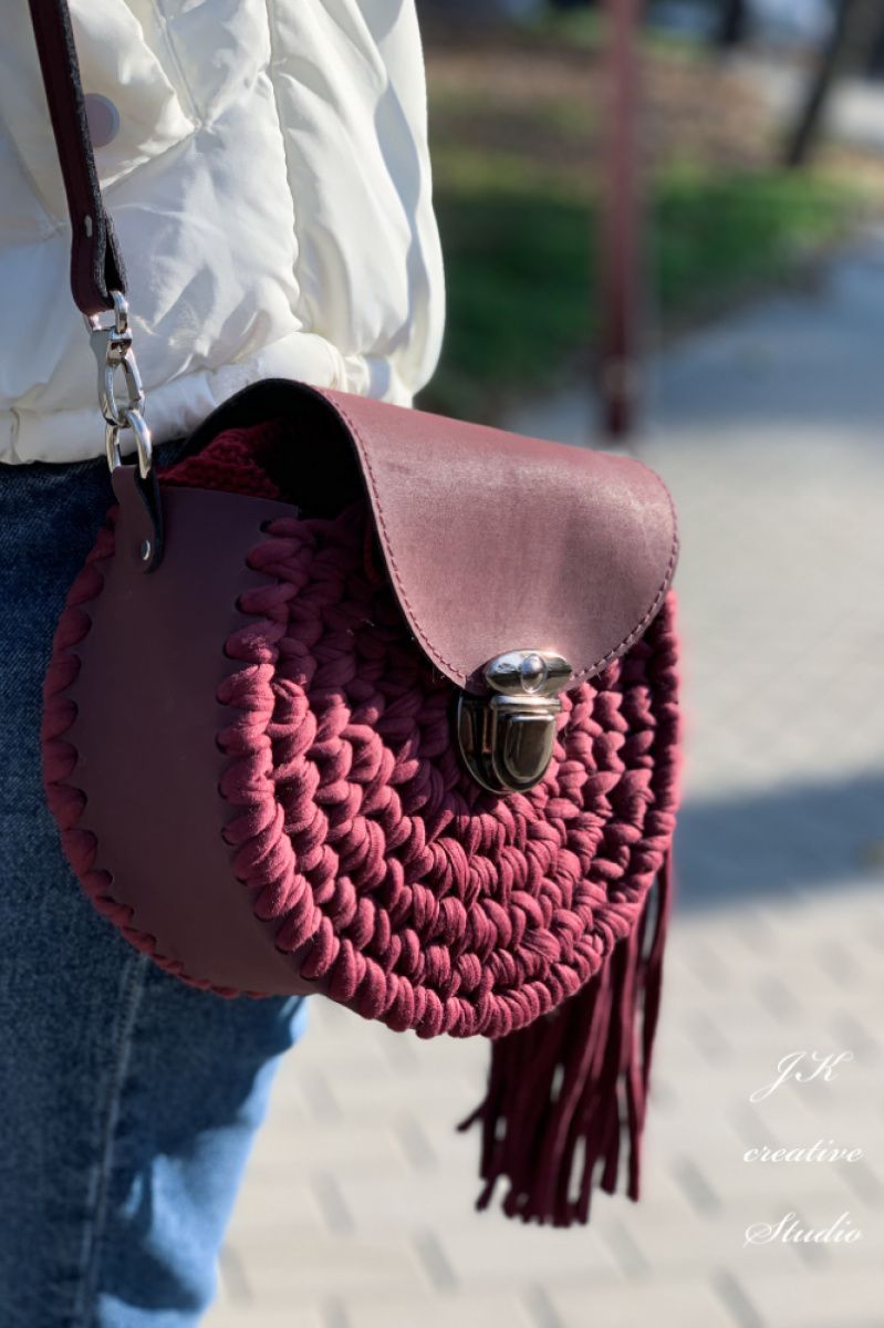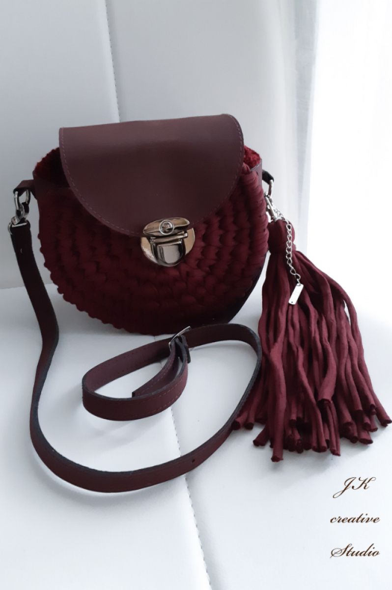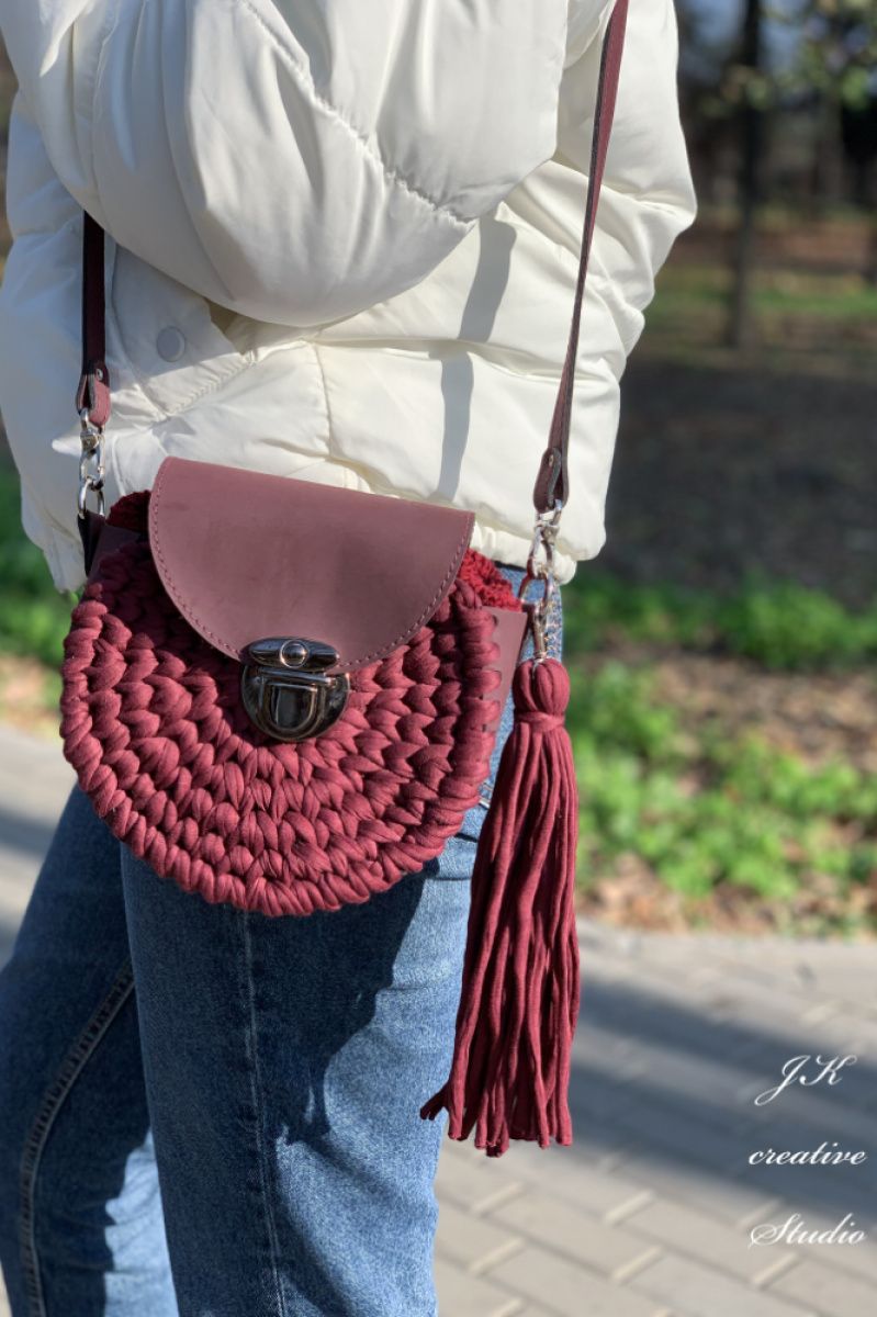 Круглая сумочка "Бордо" в стиле бохо из трикотажной пряжи с вставками из эко-кожи.