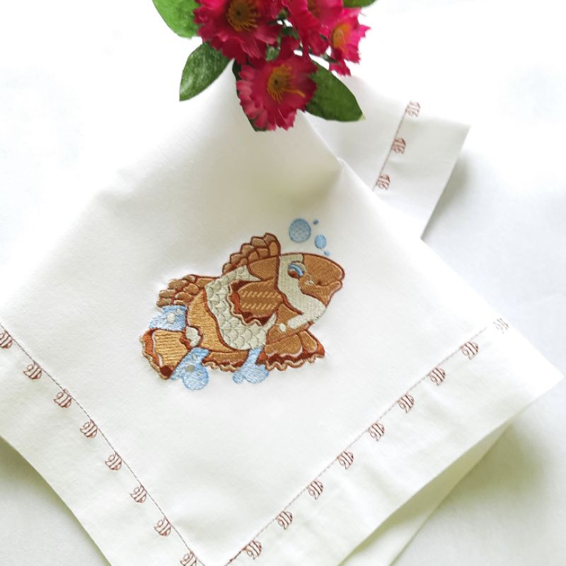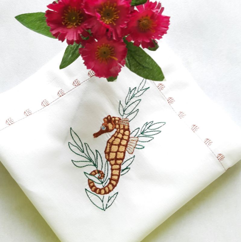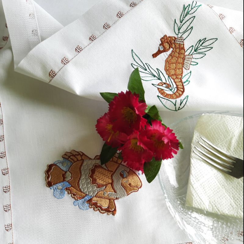 Салфетка для сервировки стола с дизайнерской рыбкой в одном уголке, морским коньком в противоположном. По периметру бортик расшит маленькими рыбками. Вышивка машинная.