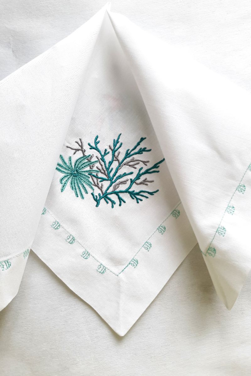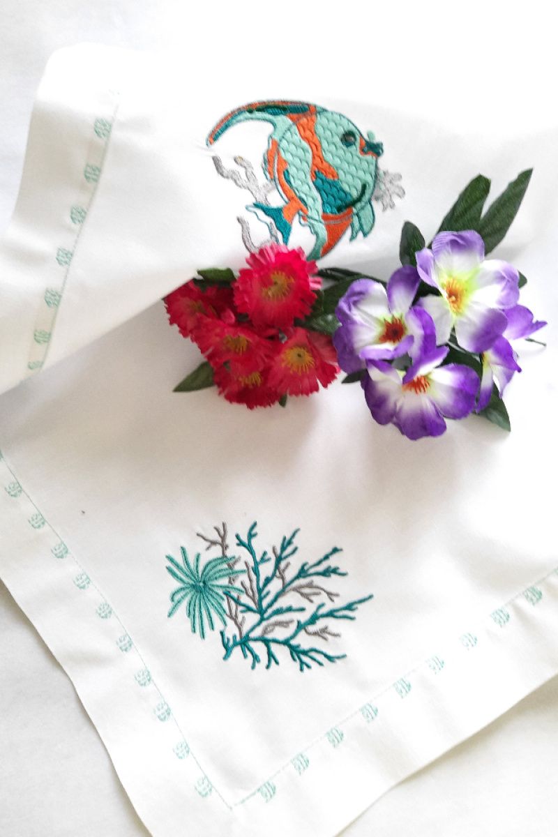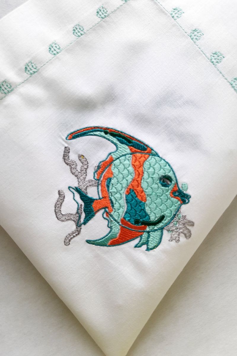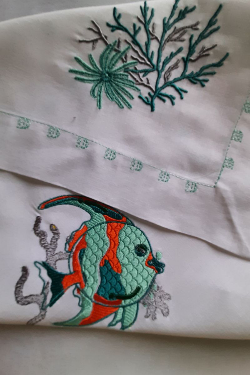 Салфетка для сервировки стола с дизайнерской рыбкой в одном уголке морскими водорослями в противоположном. По периметру бортик расшит маленькими рыбками. Вышивка машинная.