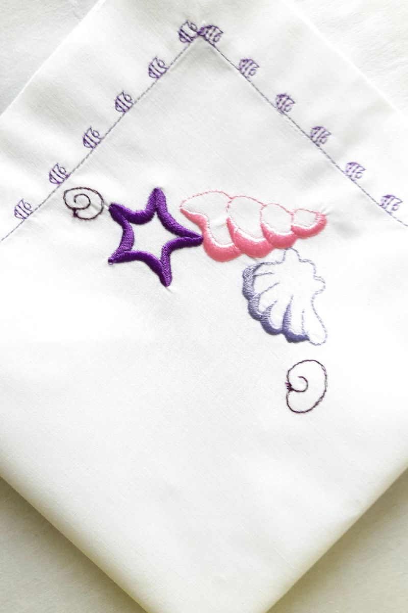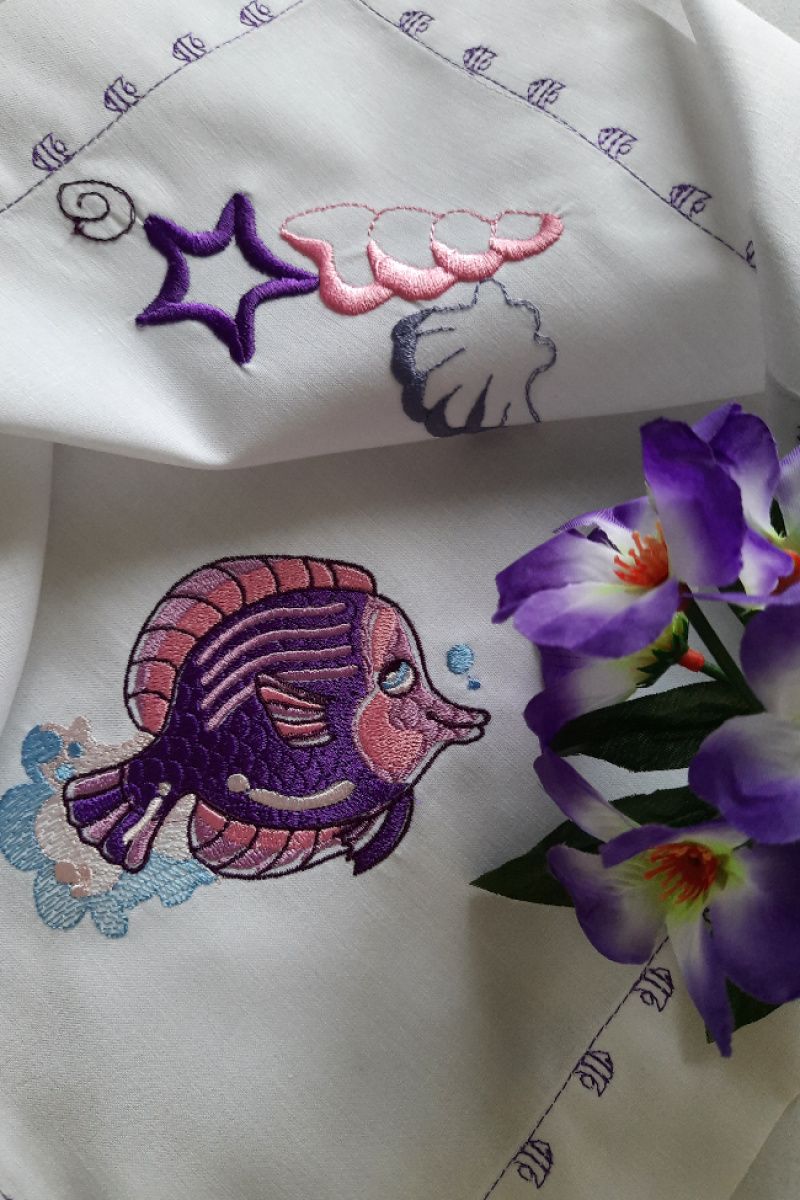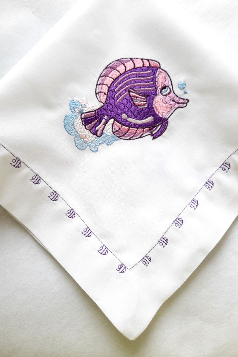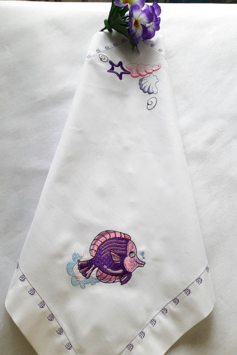 Салфетка для сервировки стола с дизайнерской рыбкой в одном уголке морской звездочкой, ракушка и жемчужинка в противоположном. По периметру бортик расшит маленькими рыбками. Вышивка машинная.