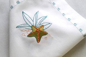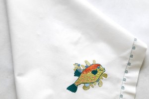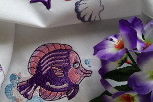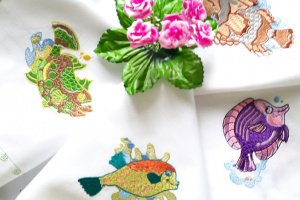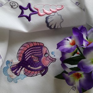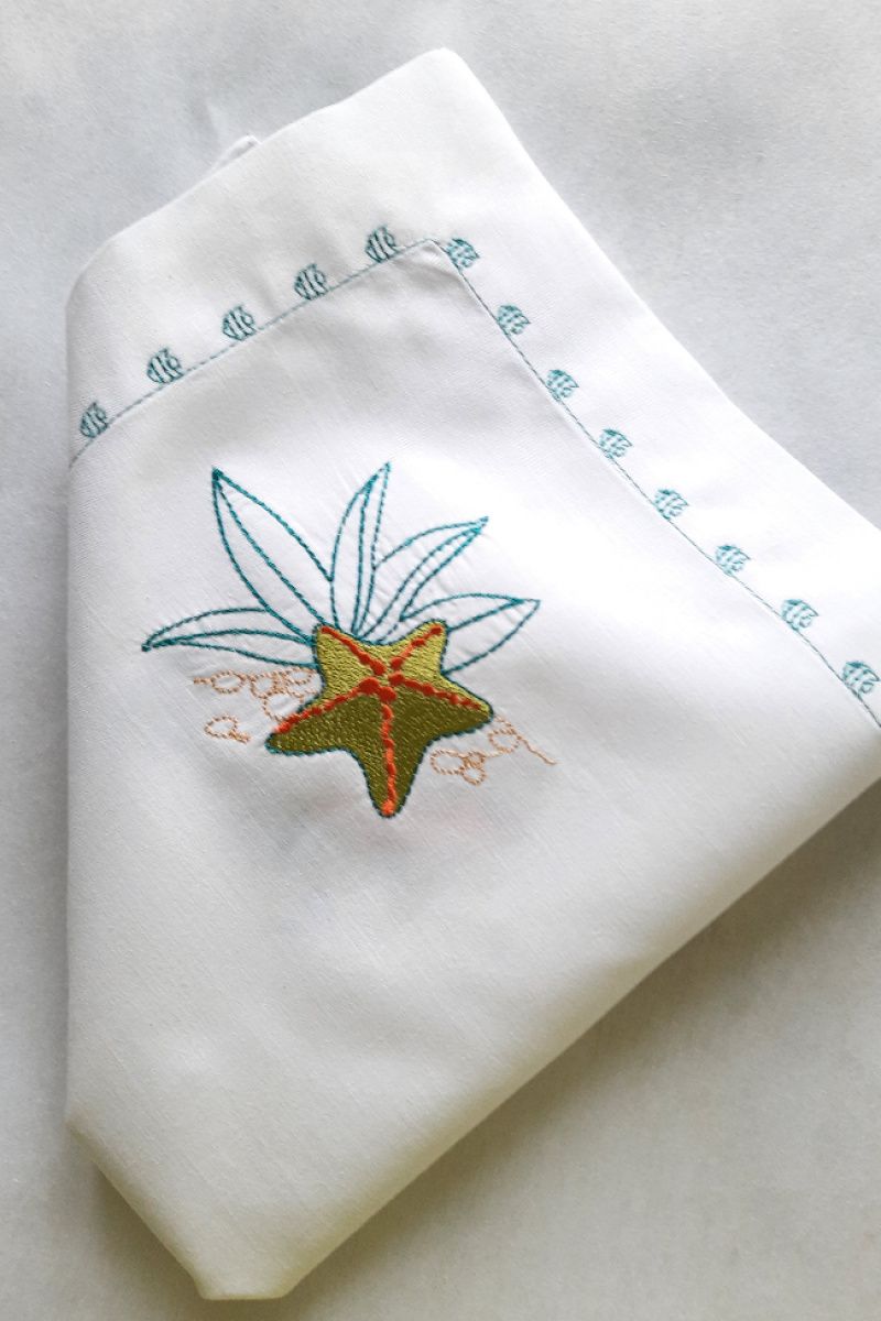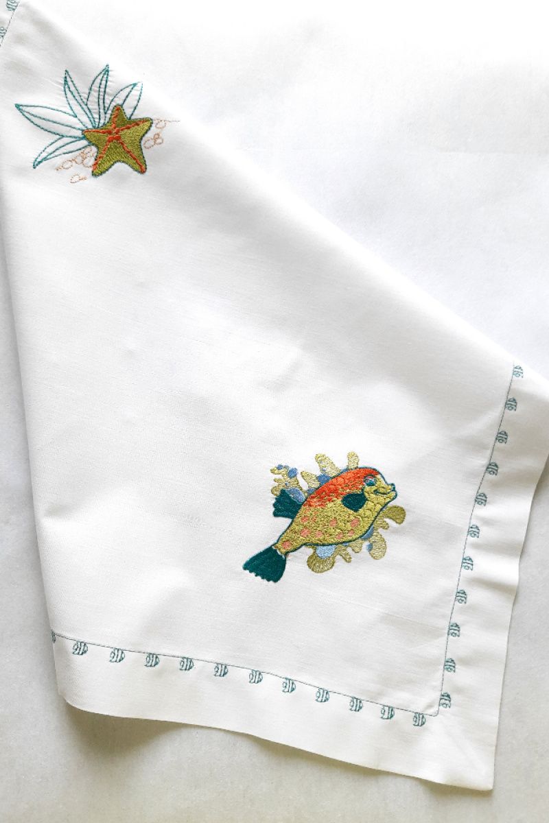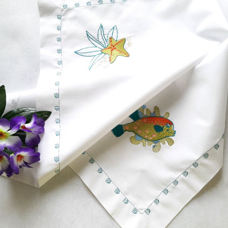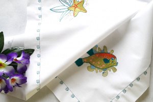 Салфетка для сервировки стола с дизайнерской рыбкой в одном уголке морской звездочкой в противоположном. По периметру бортик расшит маленькими рыбками. Вышивка машинная.