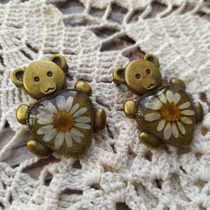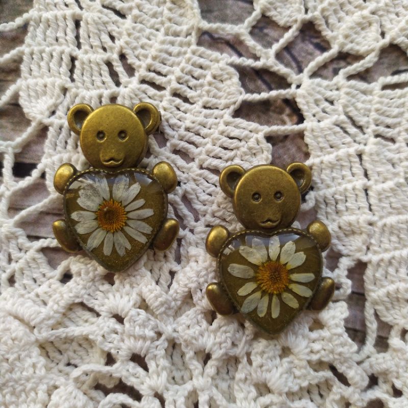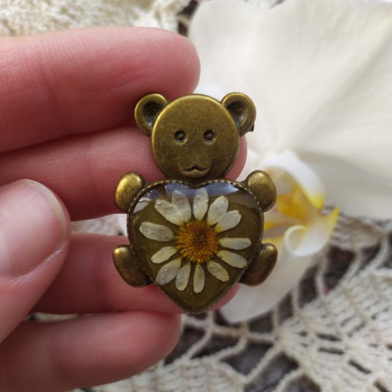 Брошь - мишка под бронзу с сердечком с настоящей ромашкой под эпоксидной смолой. Размер 3,5 см х 2,5 см. Цена указана за 1 штуку.
