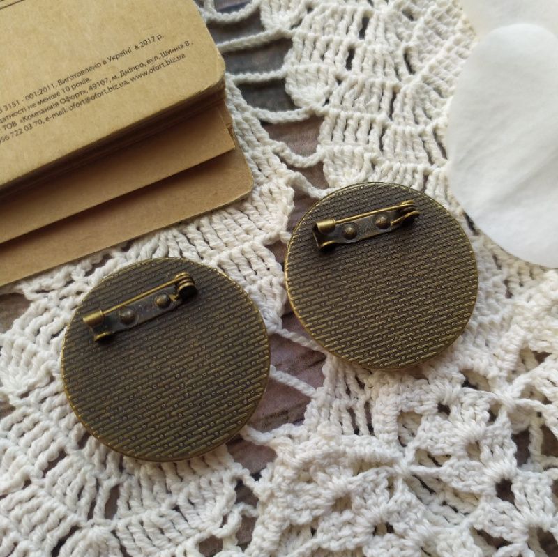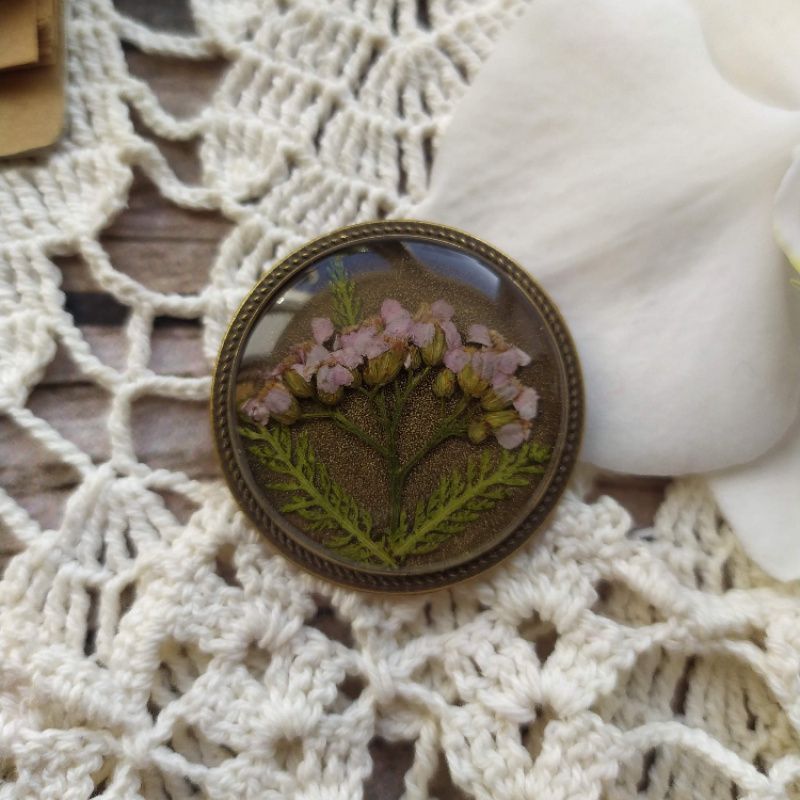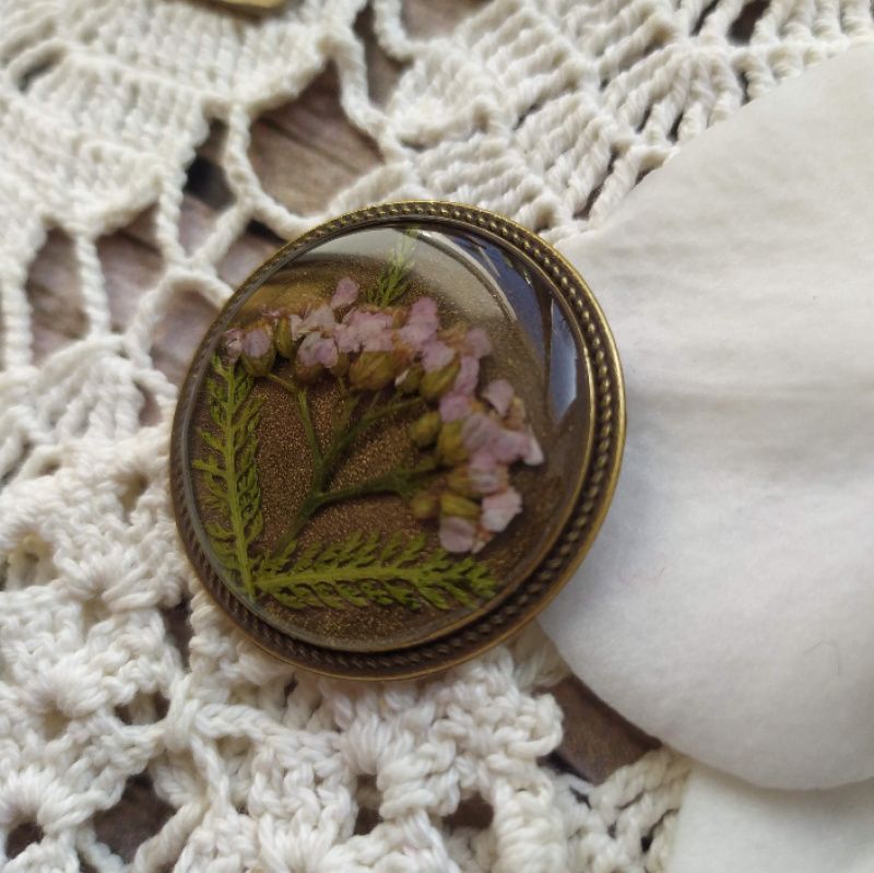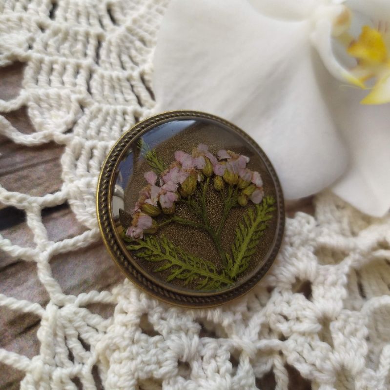 Круглая брошь под бронзу с деликатным ободком и настоящими цветами нежно-розового тысячелистника под ювелирной эпоксидной смолой. Диаметр 3,5 см.