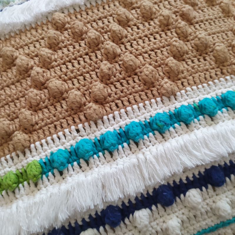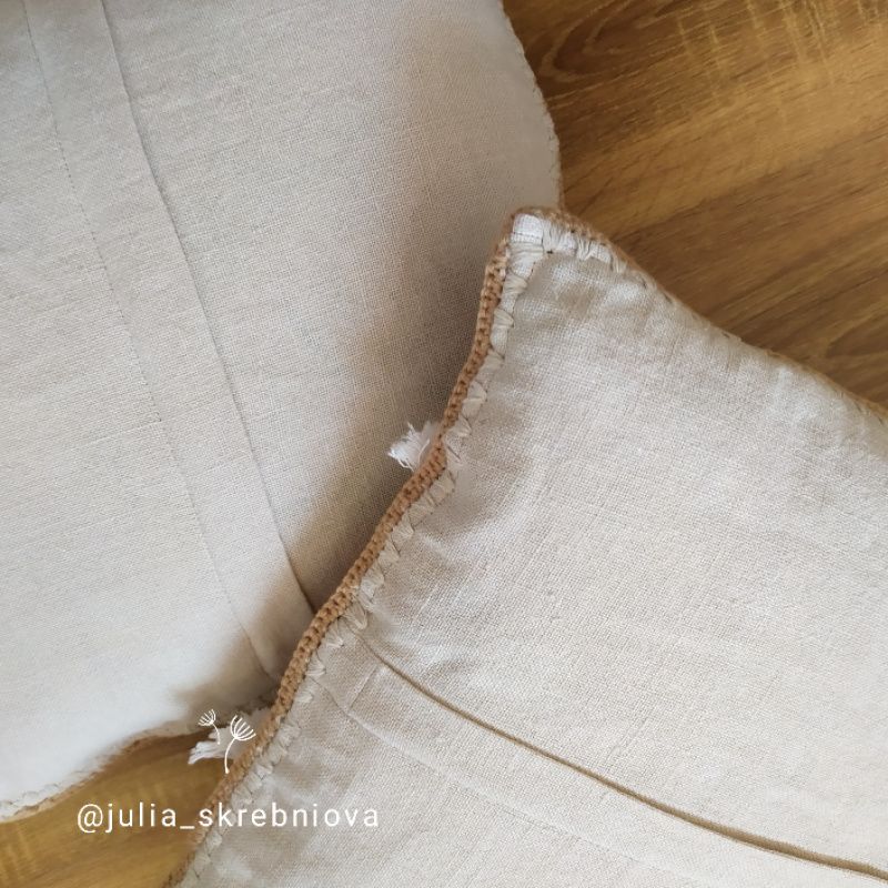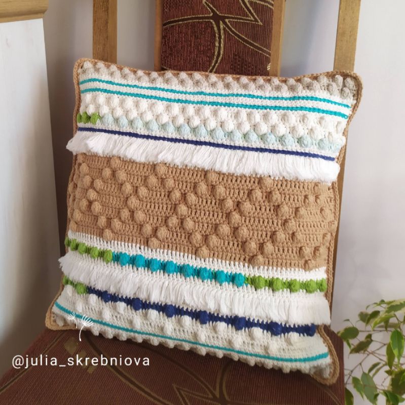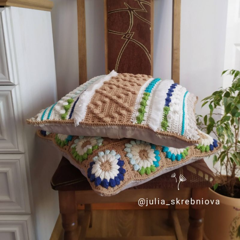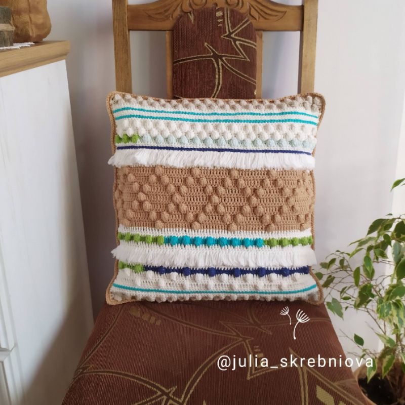 Гачкована наволочка на подушку 40х40 см. Пряжа - хлопок, есть полоски с пряжей лен / хлопок. Тыльная сторона выполнена из натуральной ткани, вшитые застежки-молнии. Благодаря натуральным материалам подушечка очень приятная тактильно.