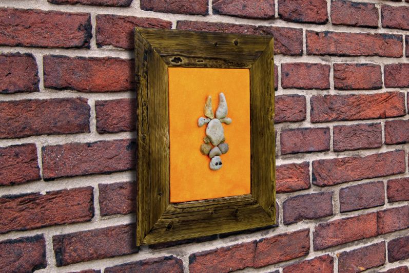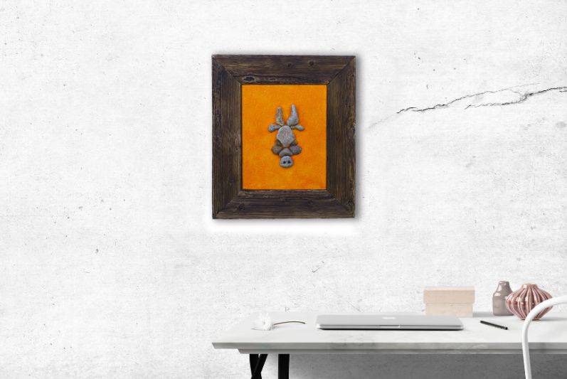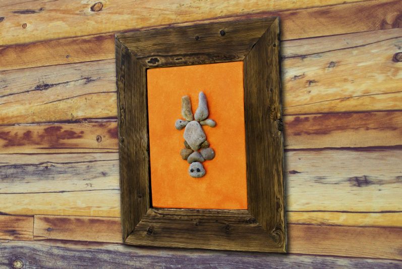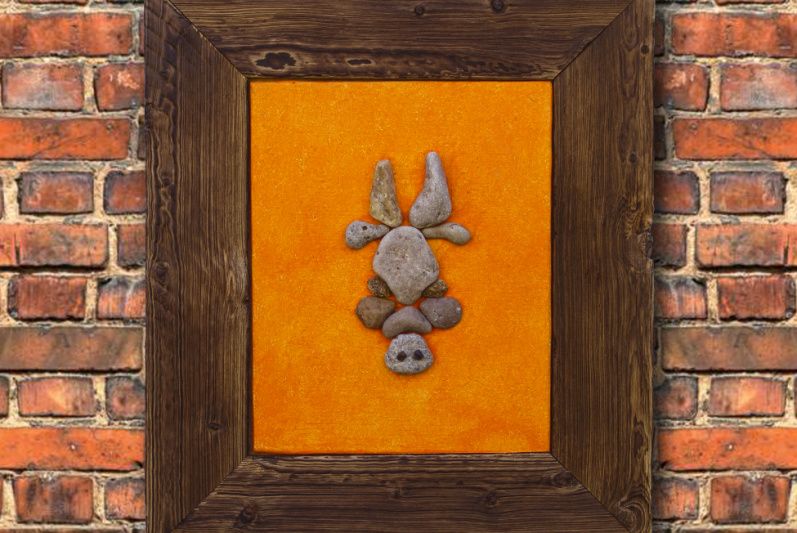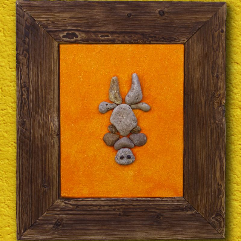 Все камни, использованные в работе, имеют свой натуральный цвет, фон выполнен на холсте акриловыми красками.