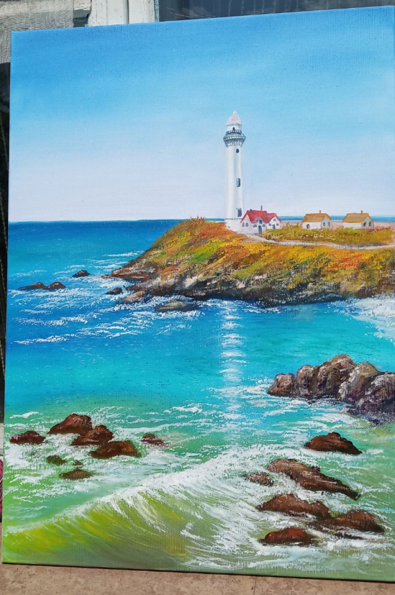 На середньому плані маяк на мисі, передній фон набігаюча хвиля на каміння при березі