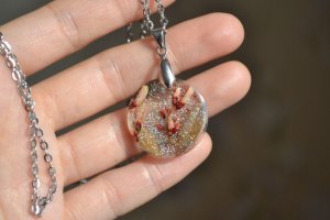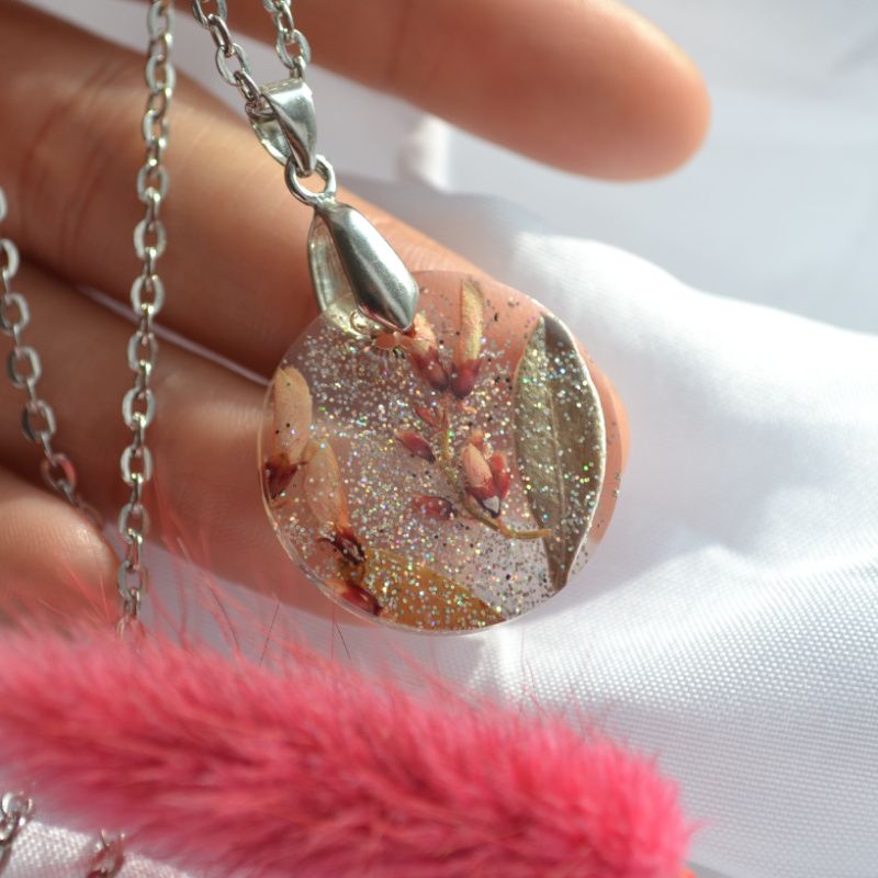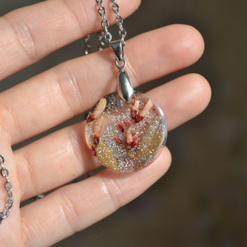 Изделие изготовлено из эпоксидной ювелирной смолы и сухоцветов. Для каждого украшения индивидуальная упаковка