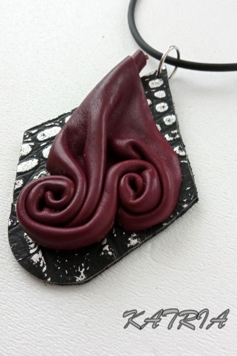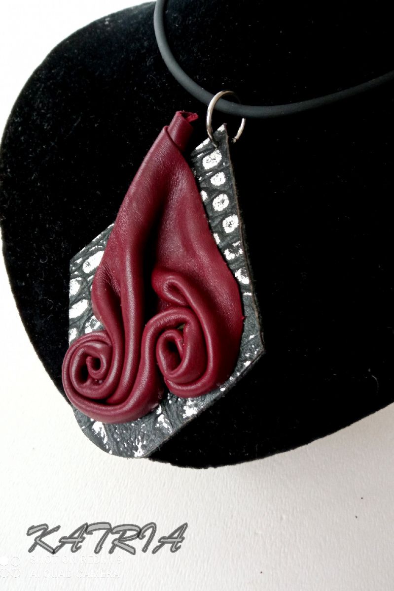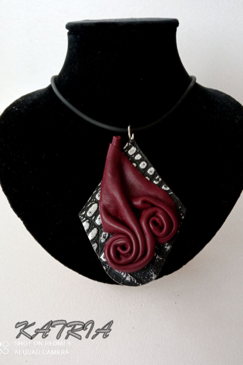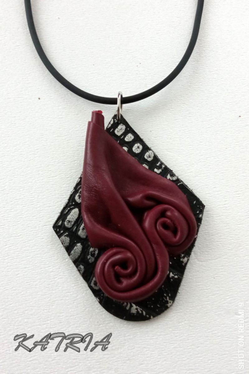 Кулон и основание выполнены из натуральной кожи на каучуковом шнуре длиной 48 см. Замочек-крючок с цепочкой.