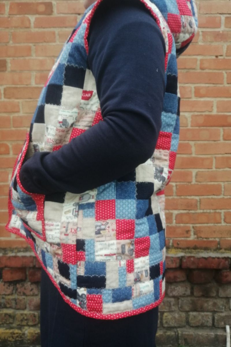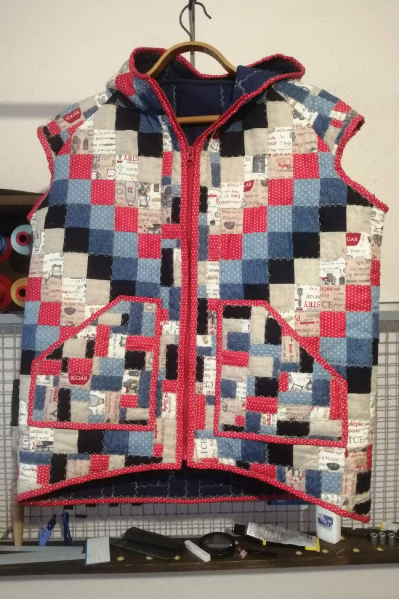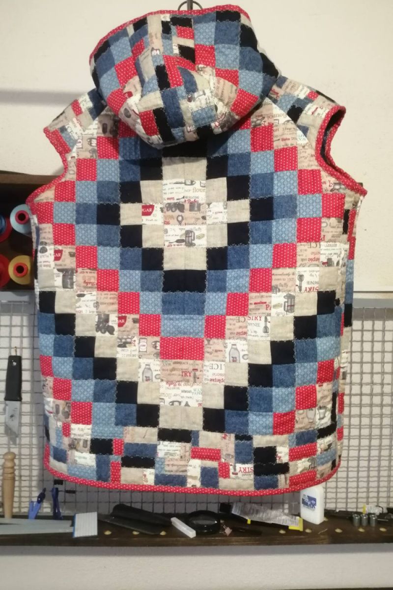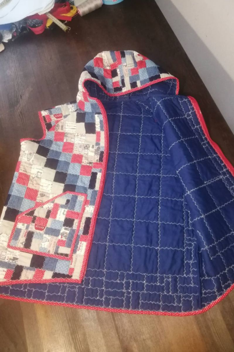 Лоскутный жакет с капюшоном, карманами, с застежкой "молния". Реглан. Изготовлен из натуральных хлопчатобумажных тканей. Наполнитель – ватин.