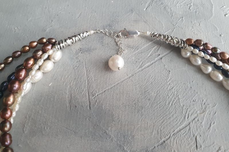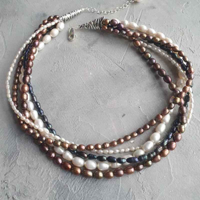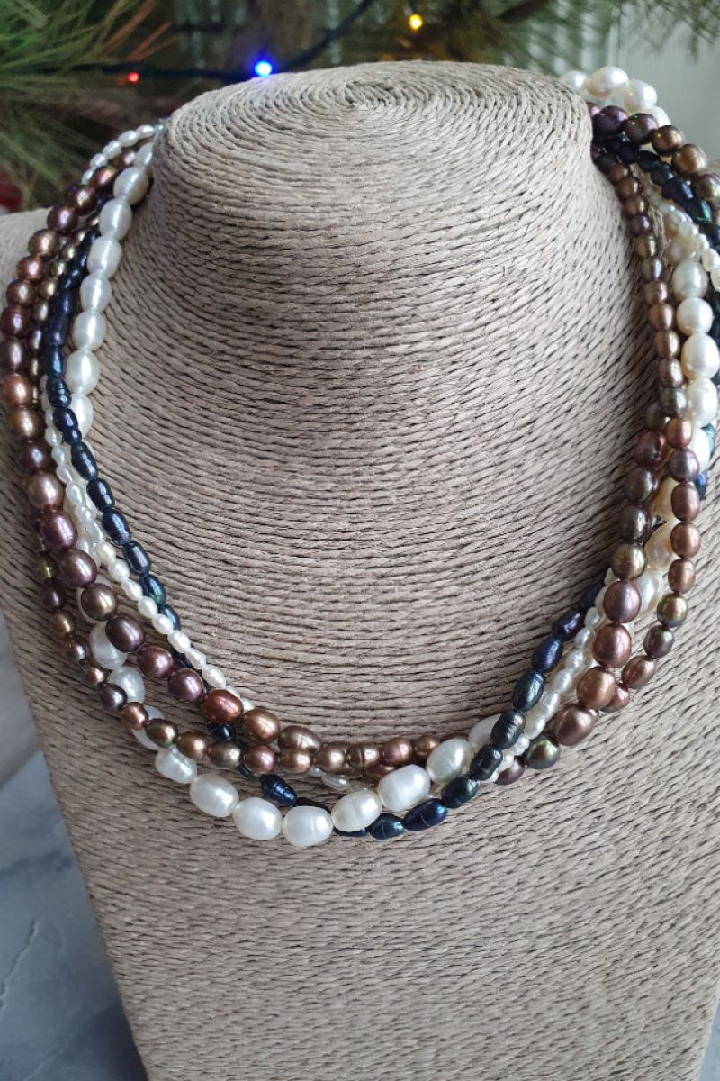 Колье собрано из 5 разных видов жемчуга формы "рис". Очень красивые цвета жемчуга.