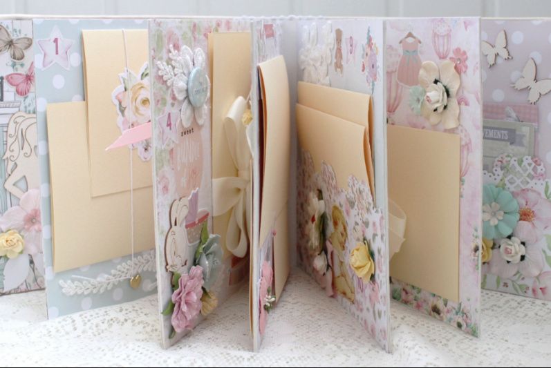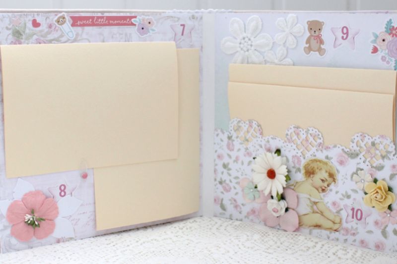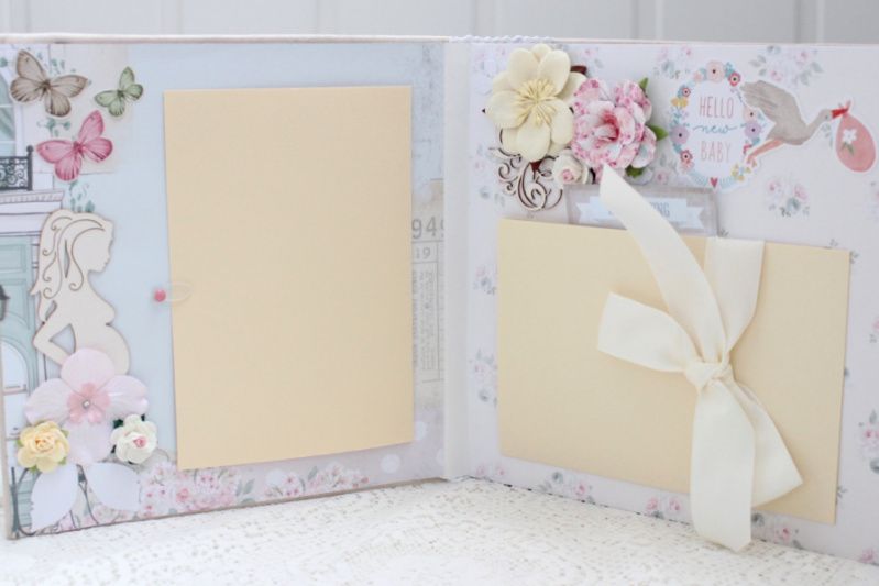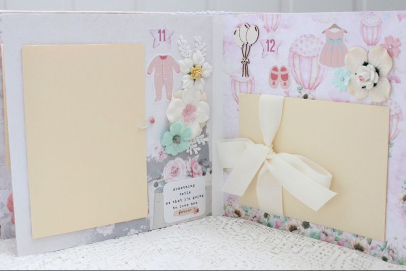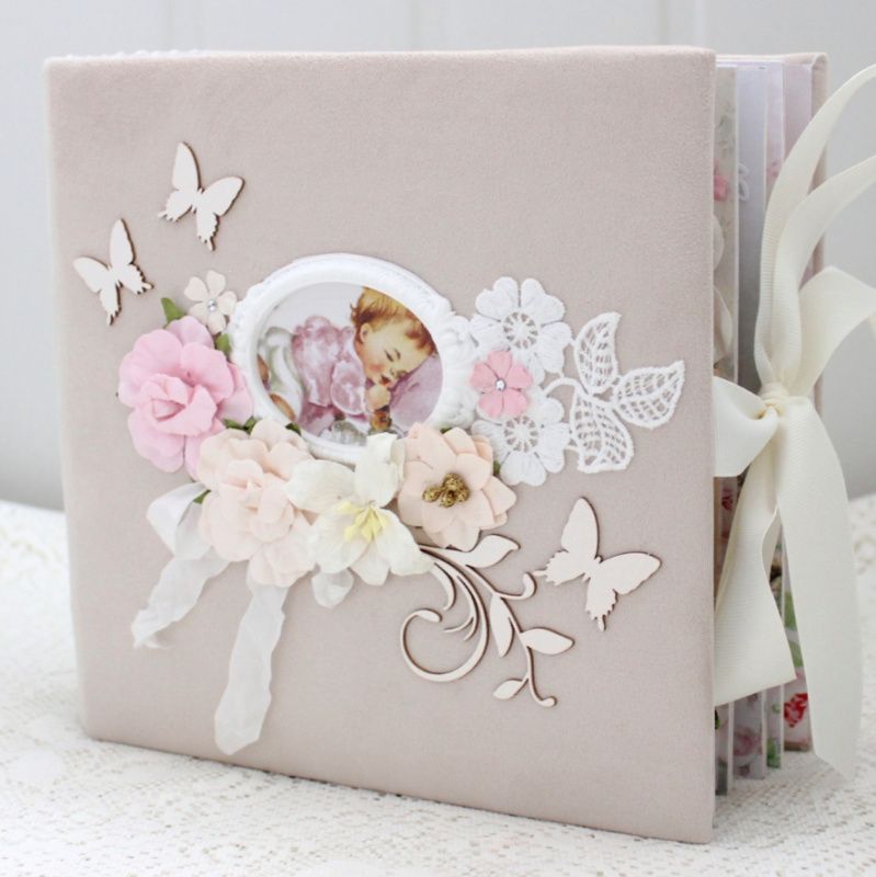 Альбом ручной работы для девочки с множеством объемных цветочков и различных украшений на каждой странице, выполнен на английском языке. Формат альбома 20х20, внутри 12 декорированных страниц, рассчитан до 50 фотографий. Альбом выполнен от ожидания малышки до годика.