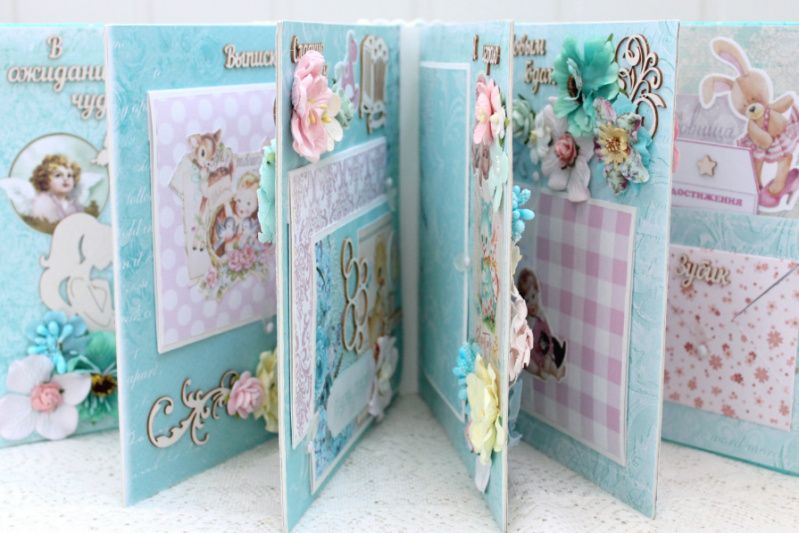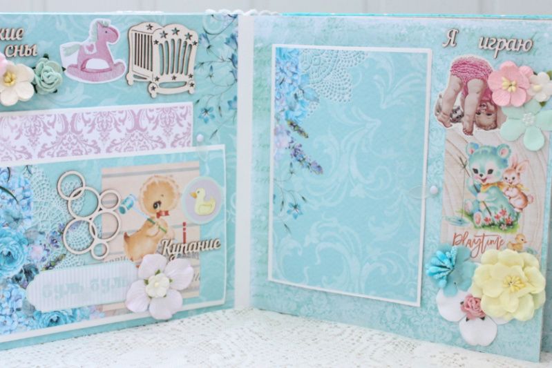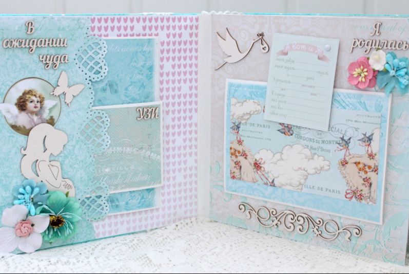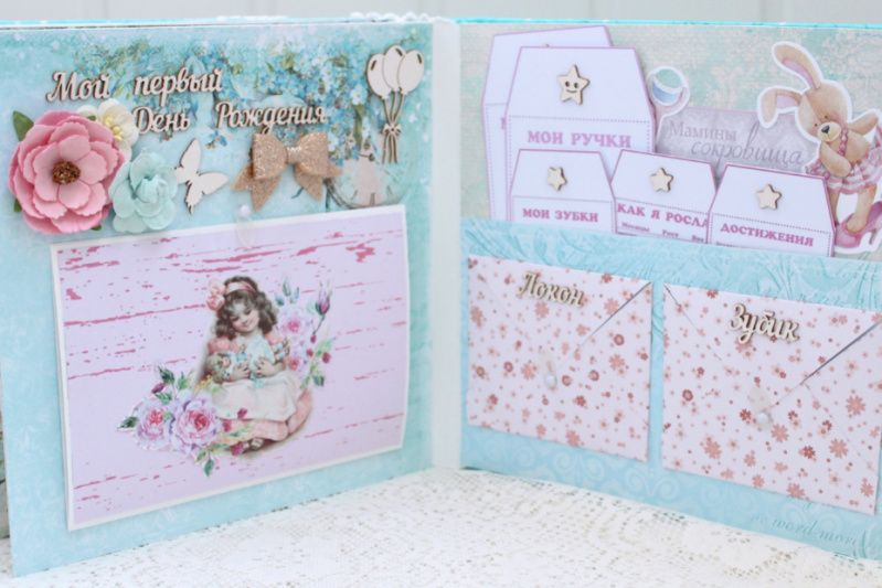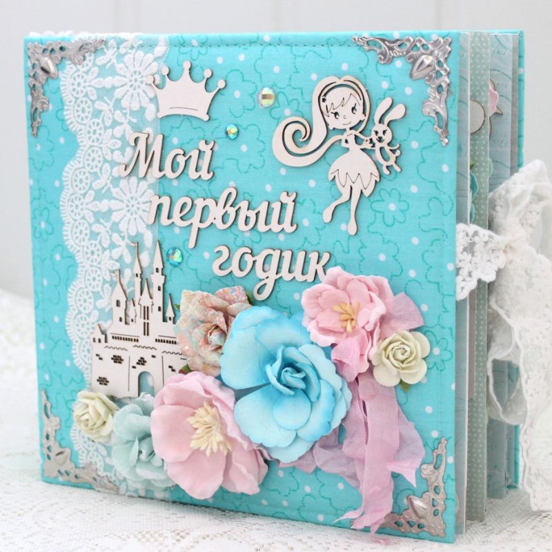 Альбом ручной работы для девочки. Формат альбома 20х20, внутри 10 декорированных тематических страниц, рассчитан до 50 фотографий. Альбом выполнен по темам: В ожидании чуда+УЗИ, Я родилась, Выписка, Счастливая семья, Наше солнышко, Сладкие сны, Купание, Я играю, таинство крещения, С Новым Годом!, Мой первый День Рождения , Мамины сокровища (конверты для бирочки, локона и зубика , таблицы роста и достижений ребенка)
