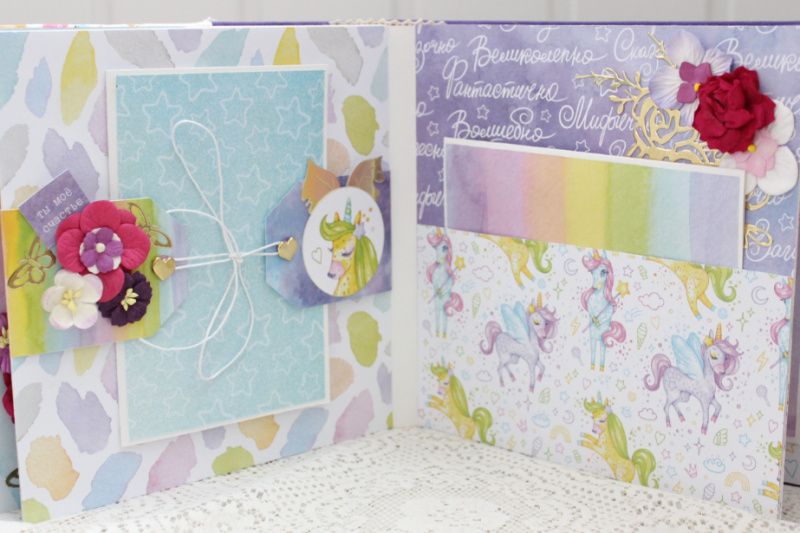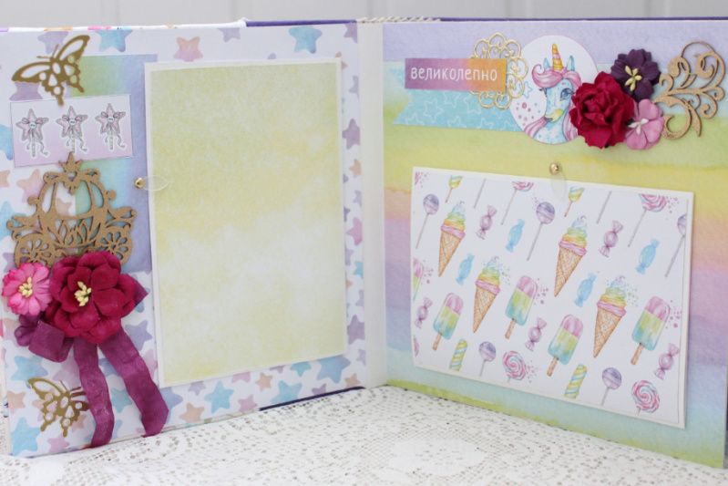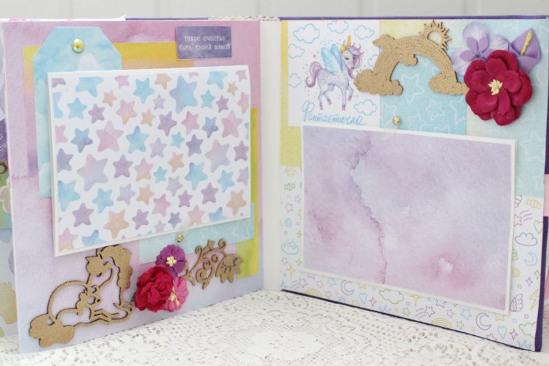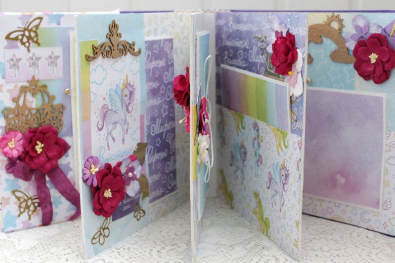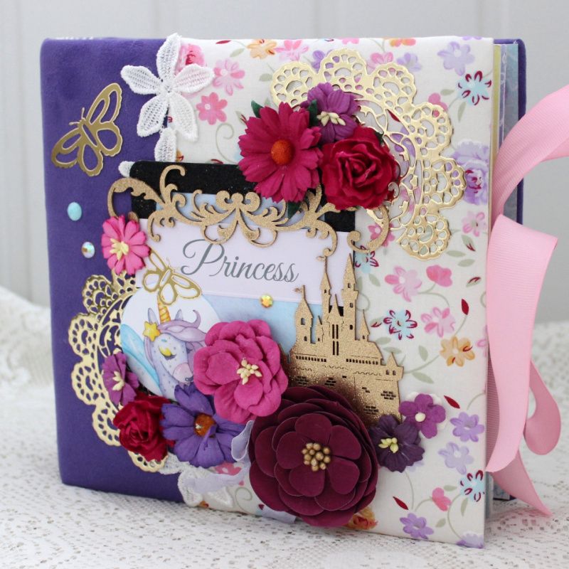 Альбом ручной работы для девочки с множеством объемных цветочных композиций и различных украшений на каждой странице. Формат альбома 20х20, внутри 8 декорированных страниц, толщина альбома 7 см, рассчитан до 40 фотографии. Альбом подойдет для девочки любого возраста, так и для новорожденного.