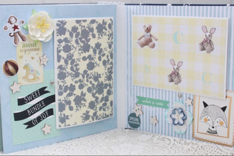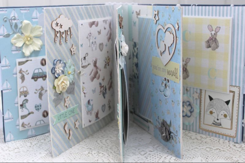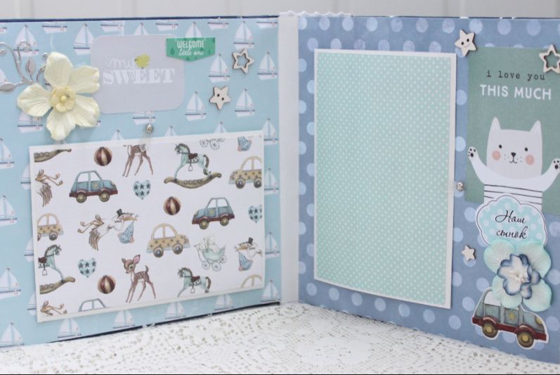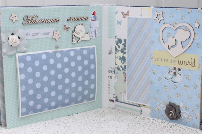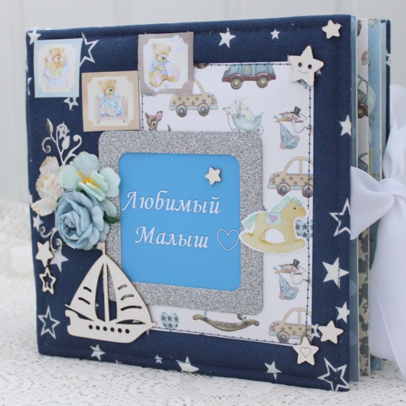 Альбом ручной работы для малыша с различным декором на каждой странице. Формат альбома 20х20, внутри 8 декорированных страниц, рассчитан до 40 фотографий. Альбом без определенных тем, подходит на любой возраст. Также в подобном стиле возможно исполнение на первый год жизни.