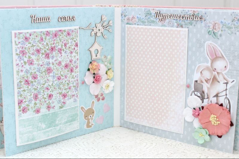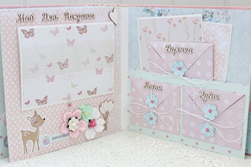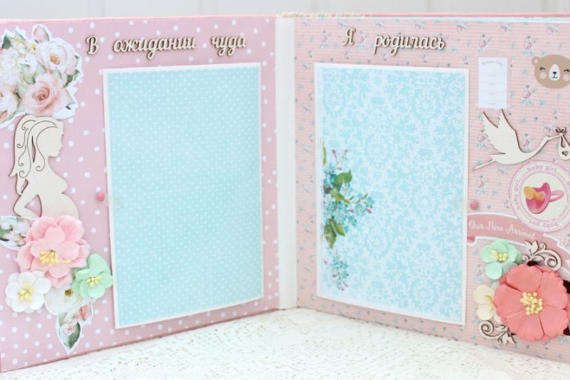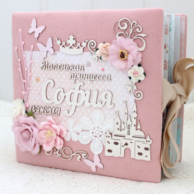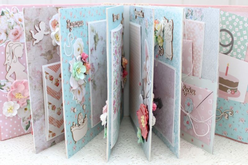 Очень объемный альбом ручной работы для девочки. Формат альбома 20х20, внутри 14 декорированных тематических страниц, толщина альбома 10 см, рассчитан до 65 фотографий. Альбом выполнен по темам: В ожидании чуда, Я родилась, Таинство крещения, Сладкие сны, Купание, Игрушки, Наша семья, Путешествие, Наше солнышко, Новый Год, Мой День Рождения, Конверты для бирочки, локона и зубика, Карточки 1-12 месяцев.