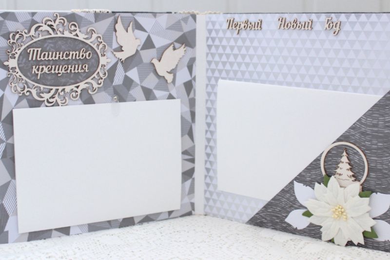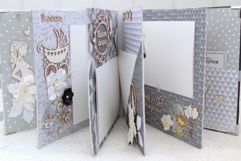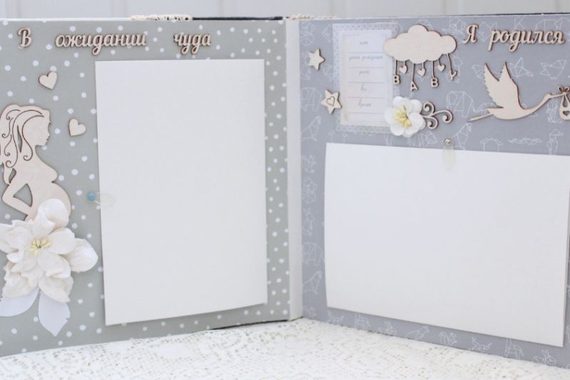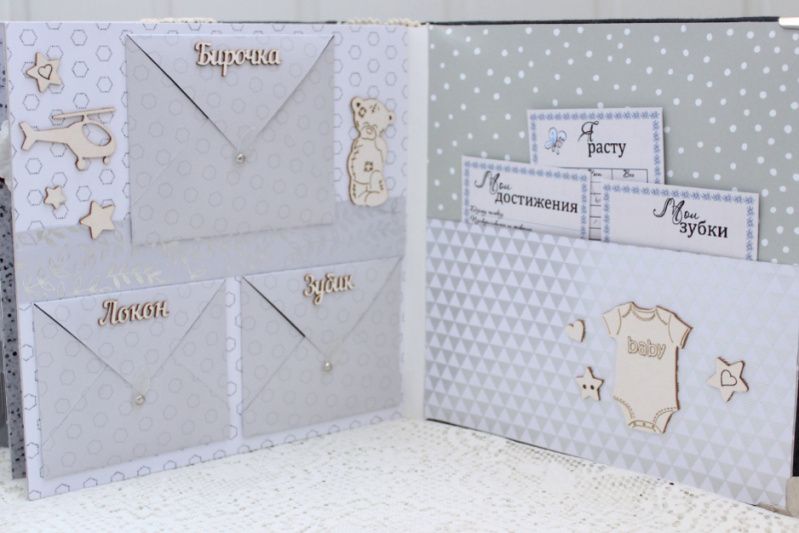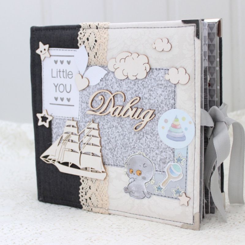 Альбом ручной работы для новорожденного мальчика. Формат альбома 20х20, внутри 10 декорированных тематических страниц, рассчитан до 40 фотографий. Альбом выполнен по темам: В ожидании чуда, Я родился, Выписка, Семья, Таинство крещения, Первый Новый Год, Наша радость, первый День Рождения, Конвертики для бирочки, локона и зубика, Таблицы роста и достижений ребенка.