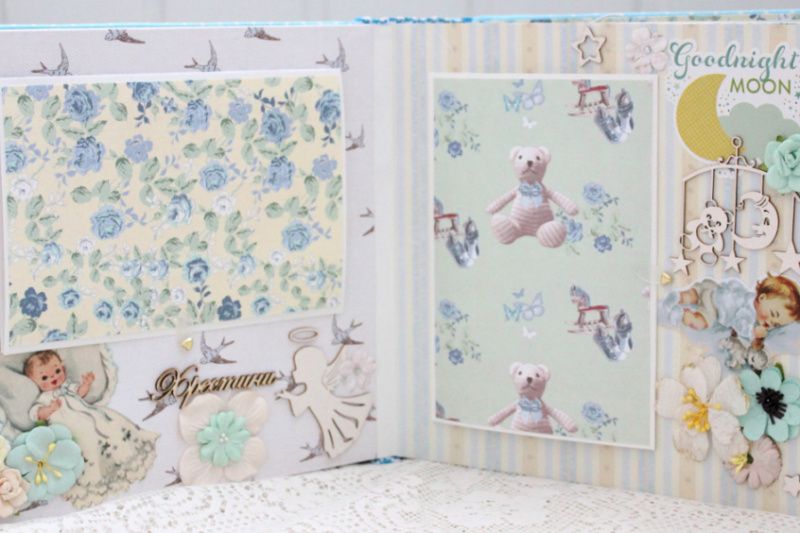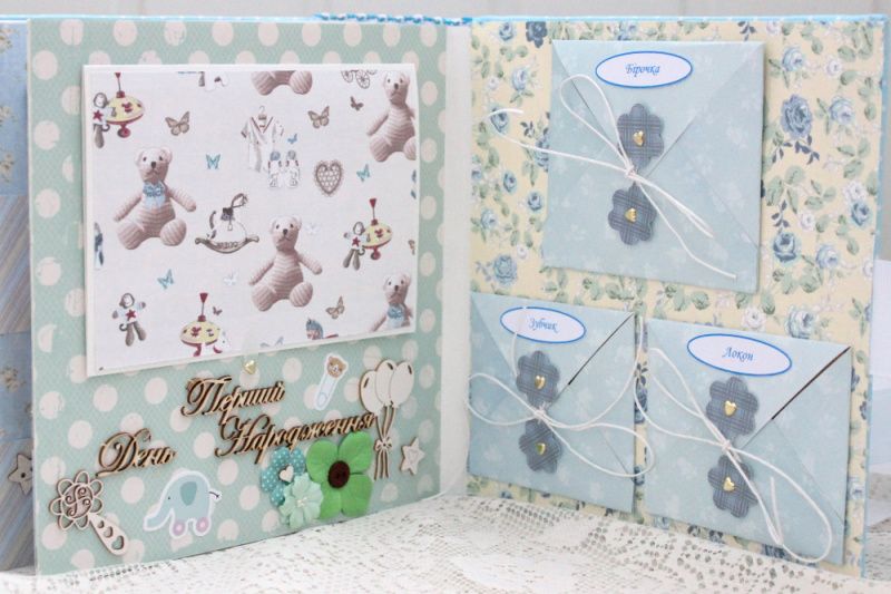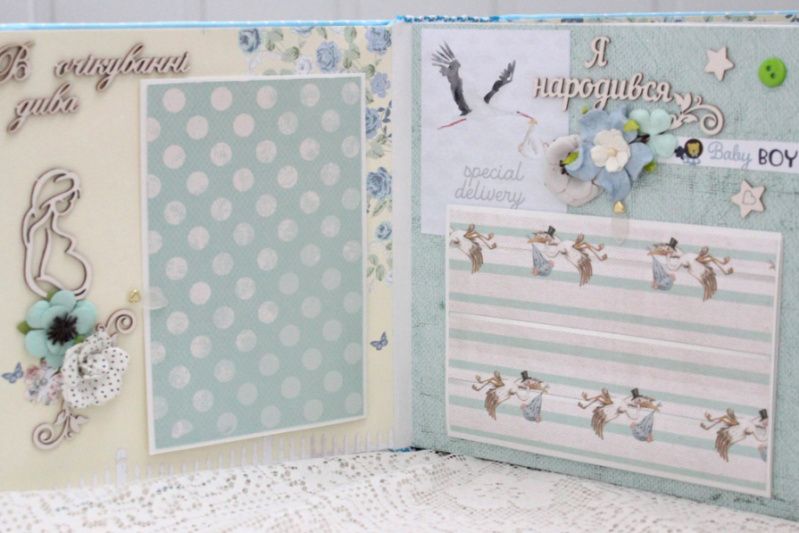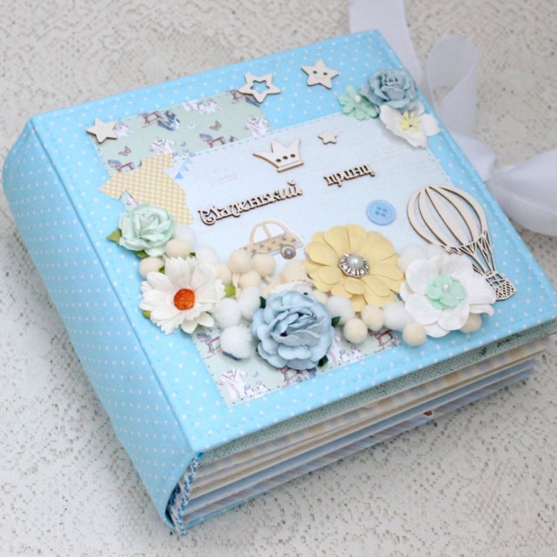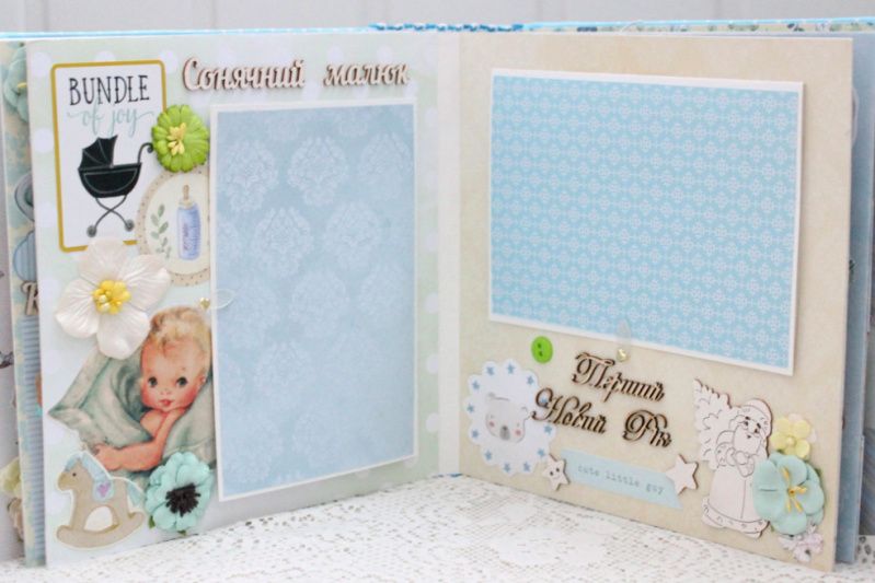 Альбом ручной работы для мальчика с различными украшениями на каждой странице. Формат альбома 20х20, внутри 14 тематических страниц с цветами и декором, толщина 8 см, на 60 фотографий. Альбом выполнен по темам: В ожидании чуда Я родился, Крестины, Сладкие сны, Купание, Время для игры, Солнечный малыш, Первый Новый Год, Россия семья, Прогулки, Карточки 1-12 месяцев, Первый День Рождения, Конверты для бирочки , локона и зубика.