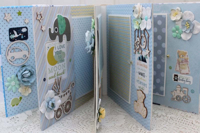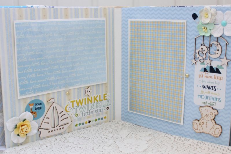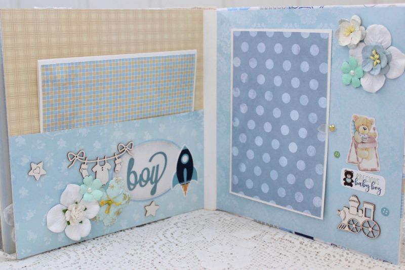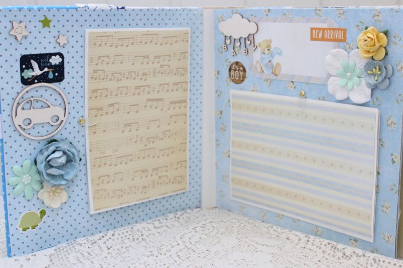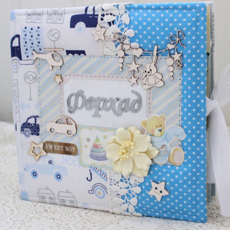 Альбом ручной работы для мальчика с множеством различных украшений на каждой странице. Формат альбома 20х20, внутри 8 декорированных страниц, рассчитан до 40 фотографий.