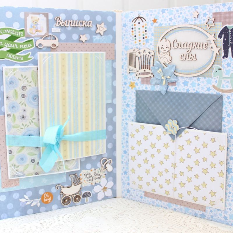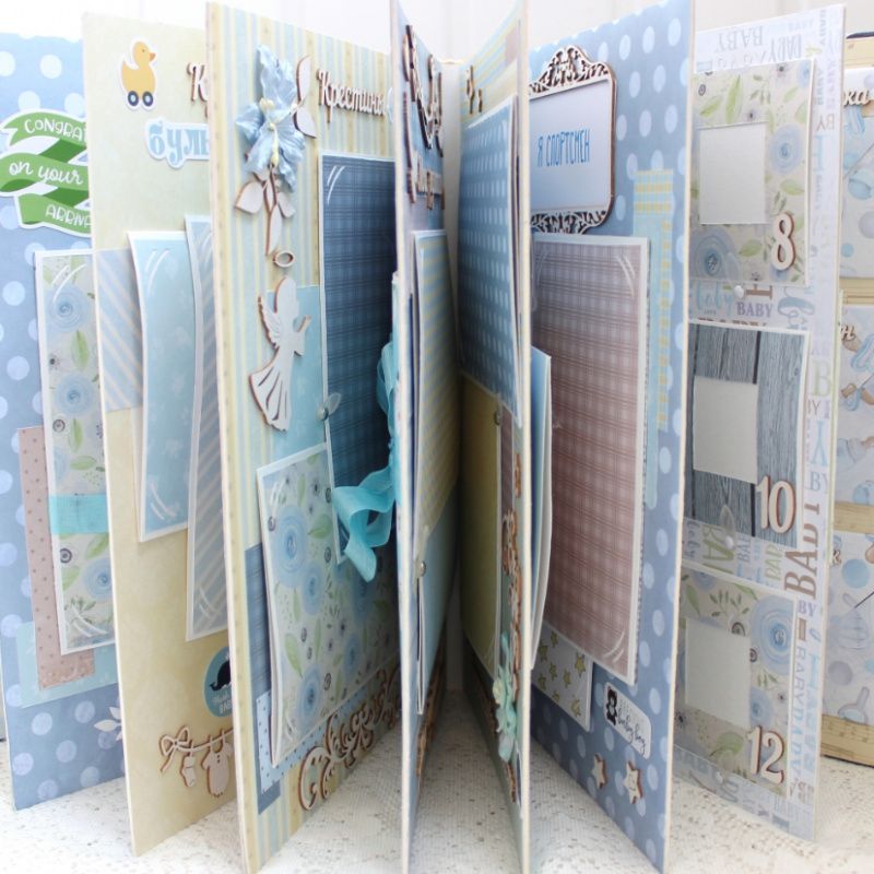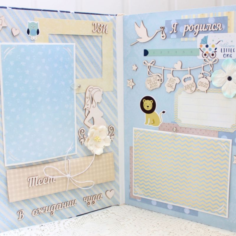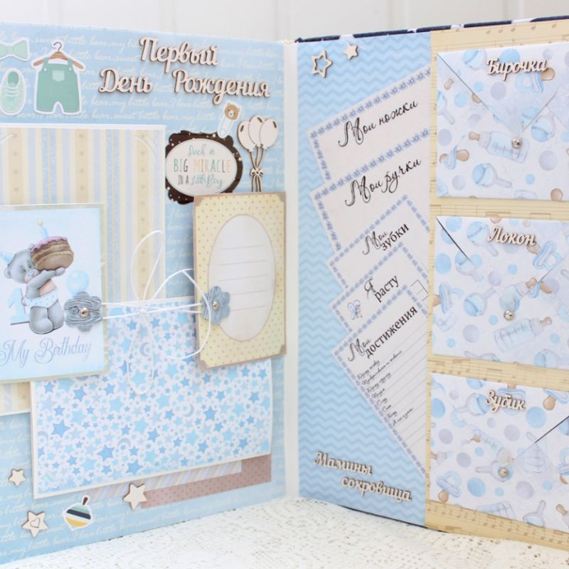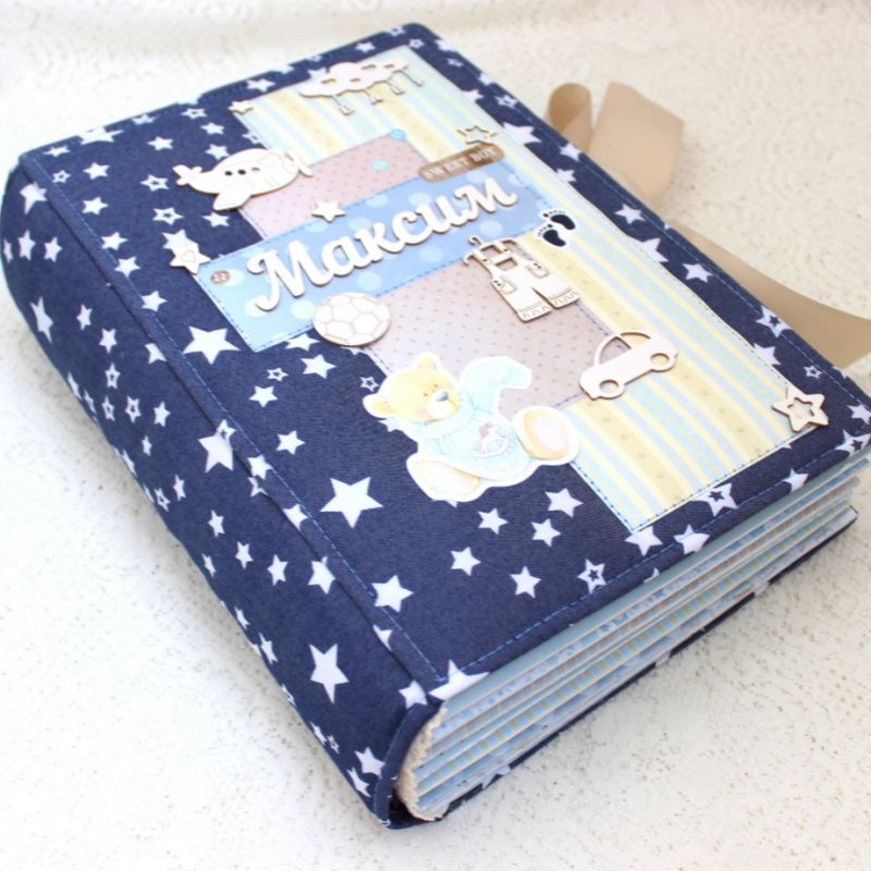 Очень объемный большой альбом ручной работы для новорожденного мальчика. Формат альбома 20х30, внутри аж 16 декорированных тематических страниц, рассчитан до 130 фотографий. Альбом выполнен по темам: В ожидании чуда + УЗИ+ Тест, Я родился + метрика, Выписка, Сладкие сны, Купание, Прогулки, Крестины, Первый Новый Год, Мои родители, Мои бабушки и дедушки, Счастливы вместе, Время игр, Я спортсмен, Маленькие фотографии 1-12 месяцев, Первый День Рождения, Конверты для бирочки,локона и зубика, Таблицы роста и достижений ребенка , Карточки для отпечатков ручки и ножки.