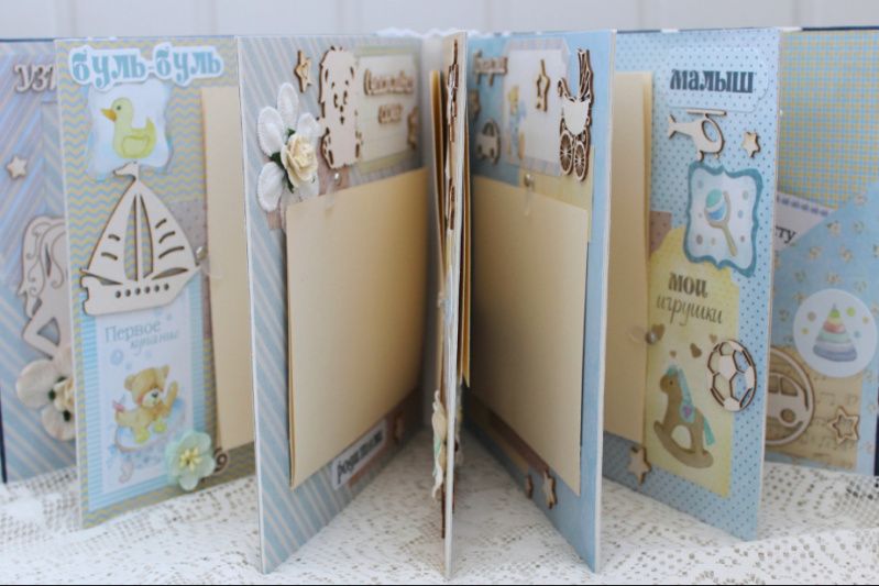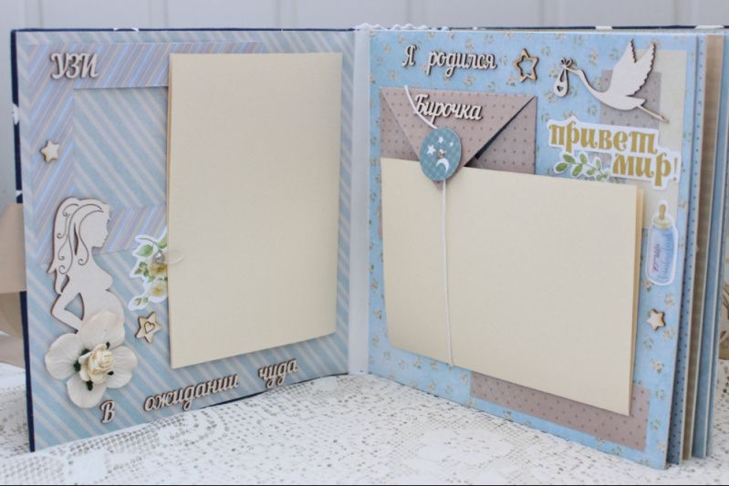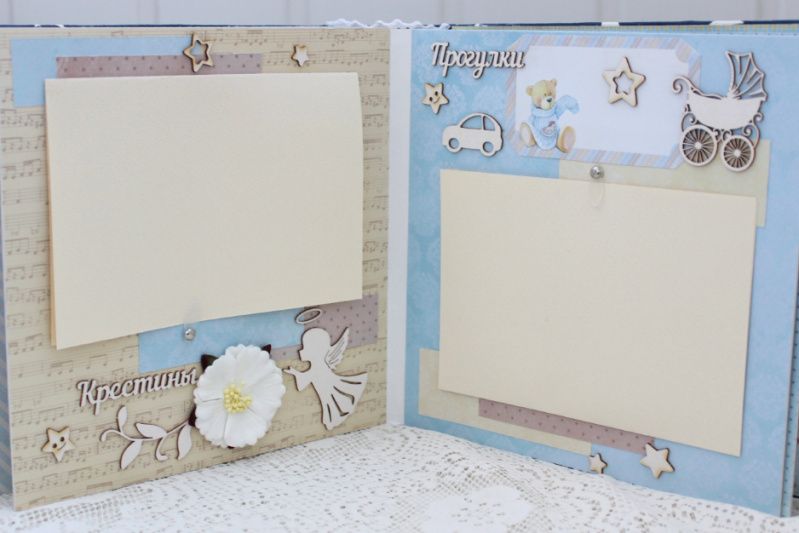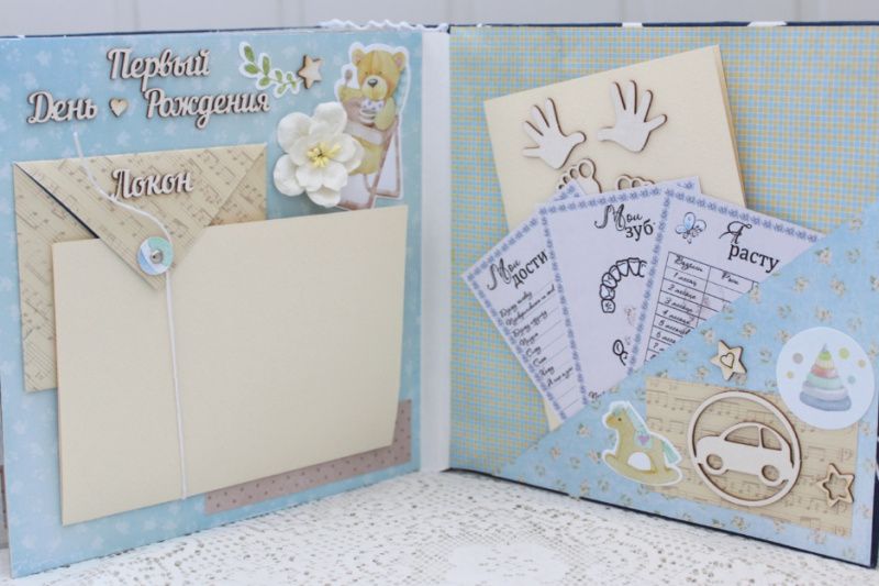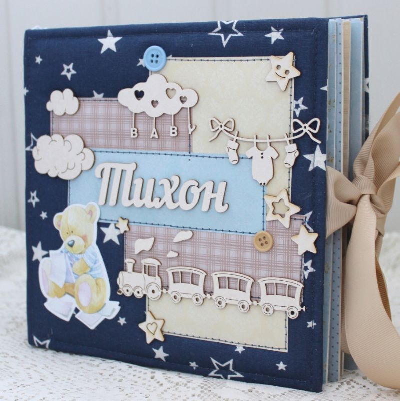 Альбом ручной работы для мальчика. Формат альбома 20х20, внутри 12 декорированных тематических страниц, рассчитан до 50 фотографий. Альбом выполнен по темам: В ожидании чуда+УЗИ, Я родился+конверт для бирочки, Первое купание, Волшебные сны, Счастливая семья (Родители, Мои бабушки и дедушки), Крестины, Прогулки, Первый Новый Год, Мои игрушки, Первый День Рождения+конверт для локона, Таблицы роста и достижений ребенка.