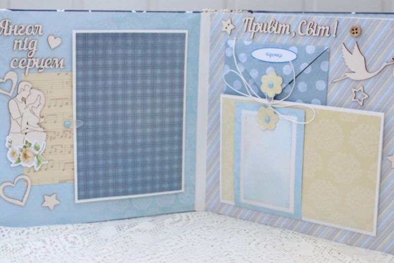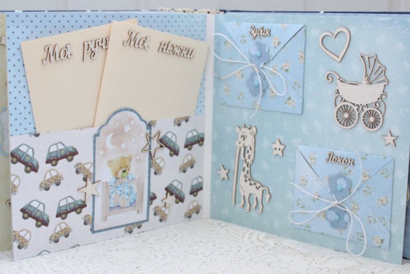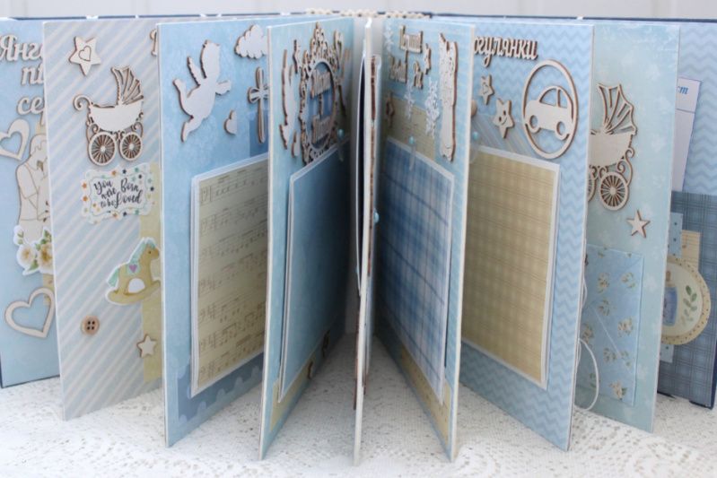 Объемный фотоальбом ручной работы для малыша. Формат альбома 20х20, внутри 16 тематических страниц с декором, рассчитан до 70 фотографий. Альбом исполнен по темам: Ангел под сердцем, Привет, Мир! конверт для бирочки , Выписка, Купание, Крестины, Сладкие сны, Мама и Папа, Бабушки и Дедушки, Наш малыш, Первый Новый Год, Время для игры, Прогулки, Мои ручки, Мои ножки, Конверты для локона и зубчика, Мой первый День Рождения , Таблицы роста и достижений ребенка.