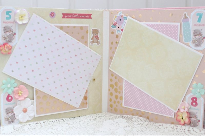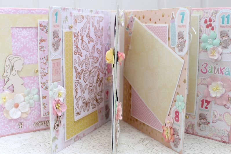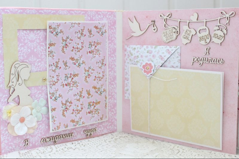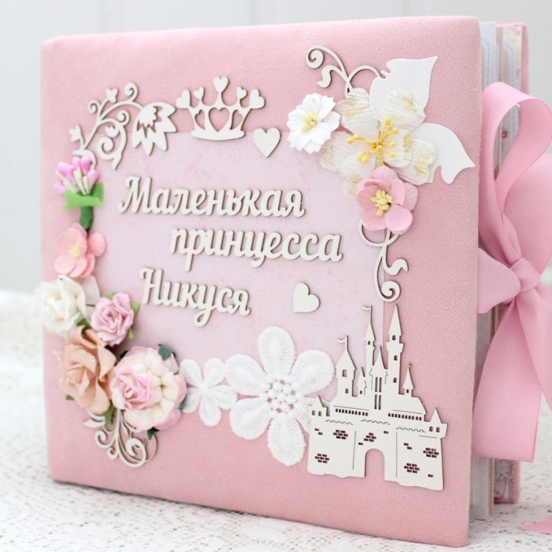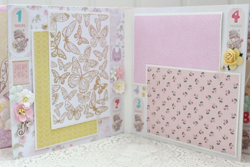 Альбом ручной работы для девочки с множеством различных украшений на каждой странице. Формат альбома 20х20, внутри 8 декорированных страниц, рассчитан на 50-55 фотографий. Альбом выполнен по темам: В ожидании чуда, Я родилась+Метрика+конверт, Фотографии 1-12 месяцев.