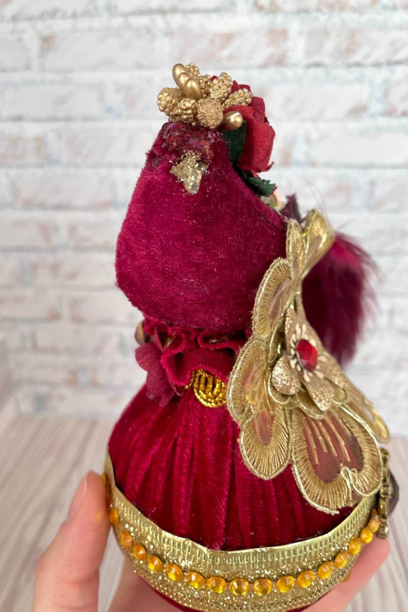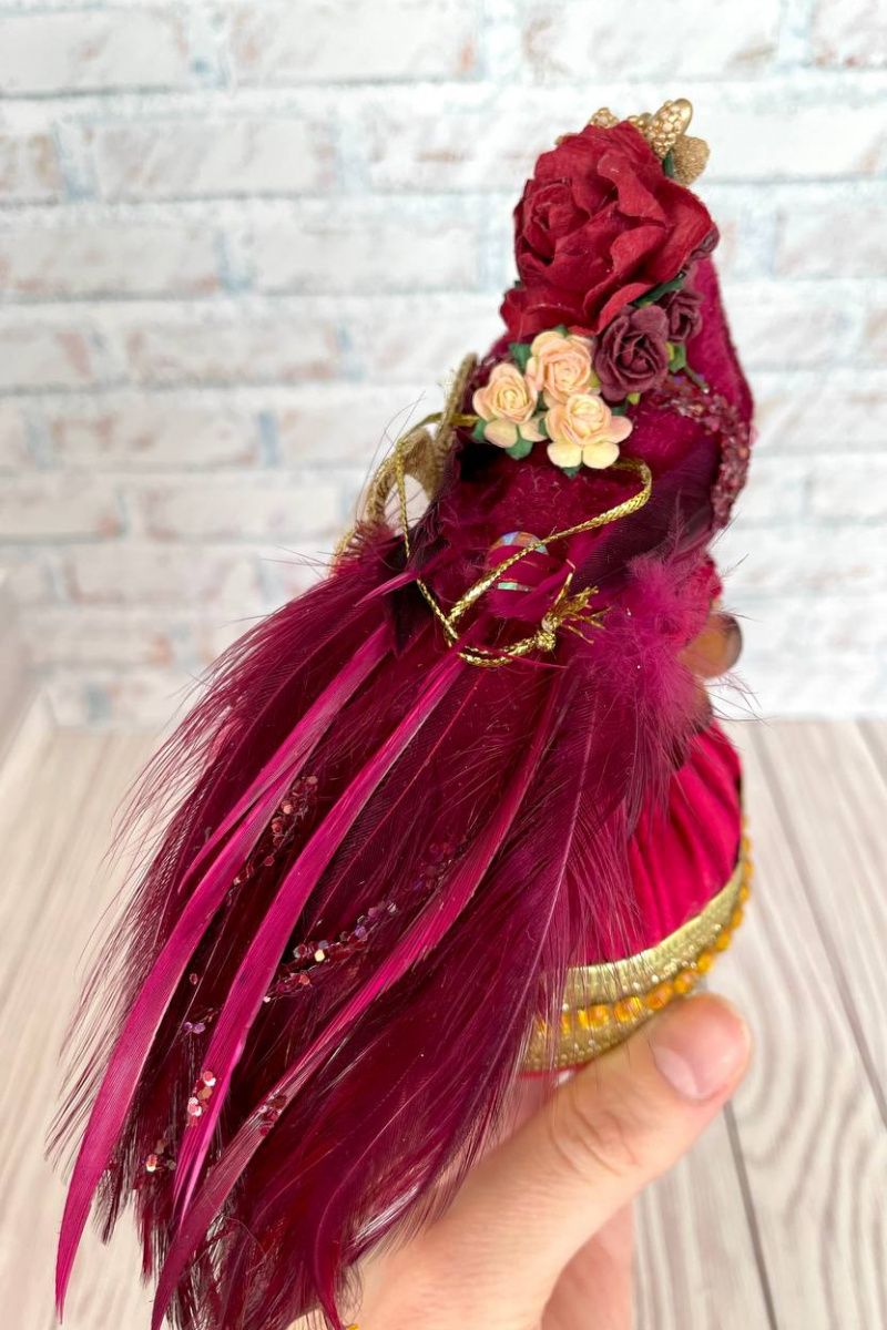 Высота игрушки 15 см, диаметр шара 8 см, материал шара - пластик. Шар обтянут бархатом и декорирована объемными бумажными цветами и кружевными элементами .