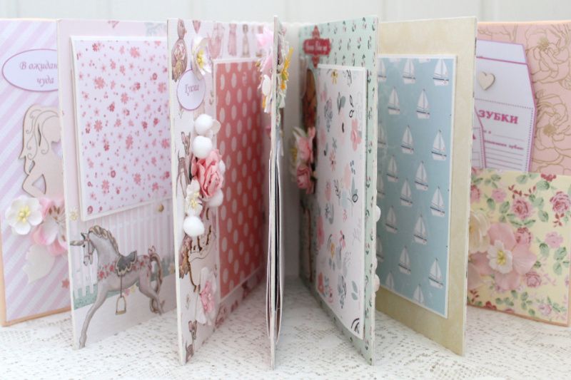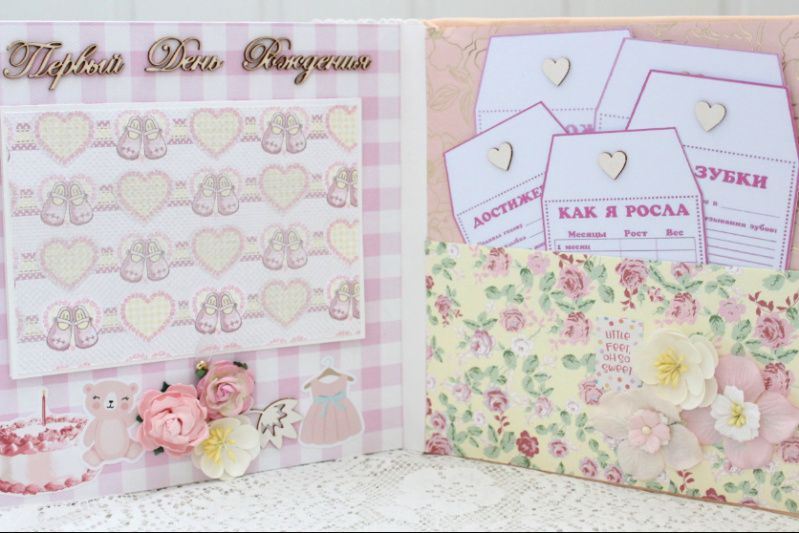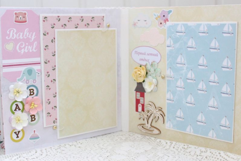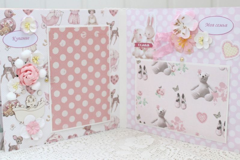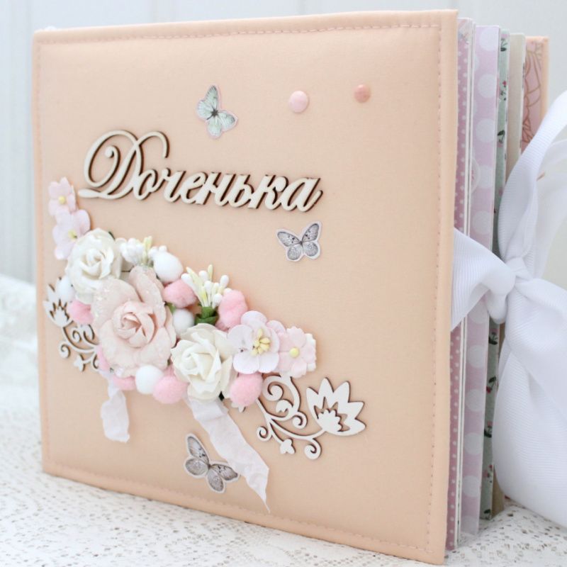 Объемный альбом ручной работы для новорожденной девочки. Формат альбома 20х20, внутри 12 тематических декорированных страниц, толщина альбома 9 см, рассчитан до 60 фотографий. Альбом выполнен по темам: В ожидании чуда, Первые деньки дома, Сладкие сны, Купание, Моя семья, Крестины, Новый Год, Baby girl , Первый летний отдых, Первый День Рождения, Таблицы роста и достижений ребенка.
