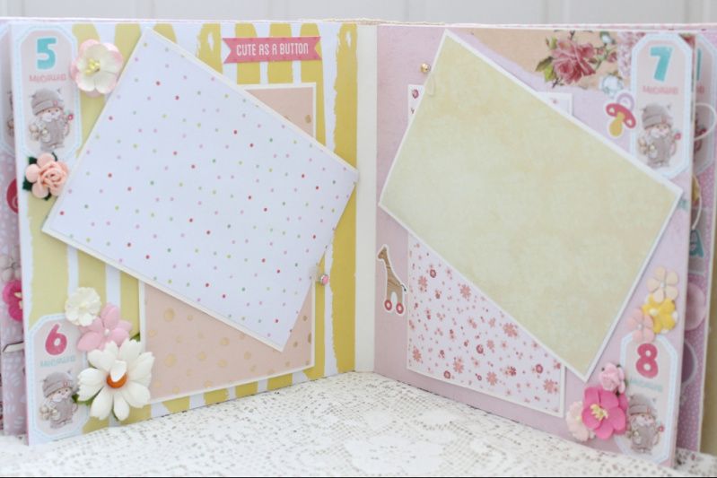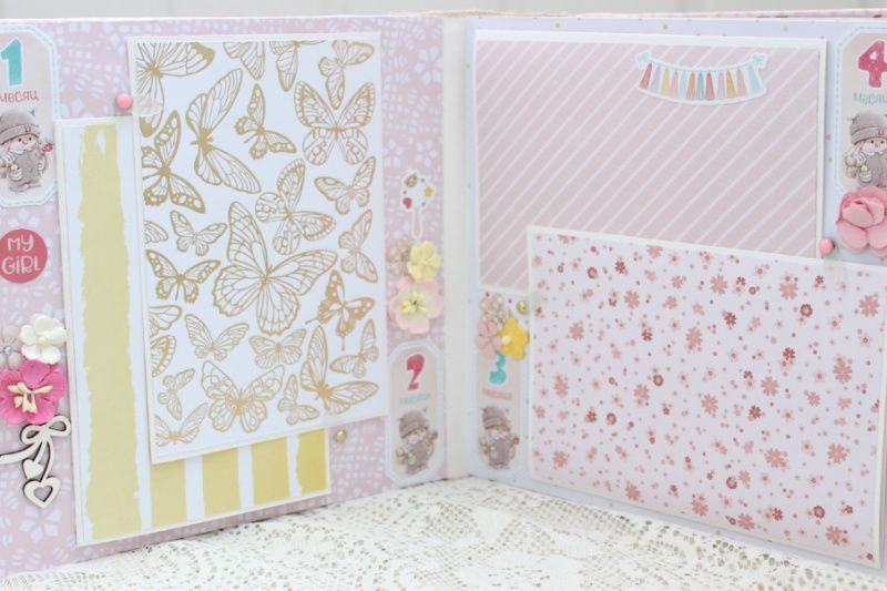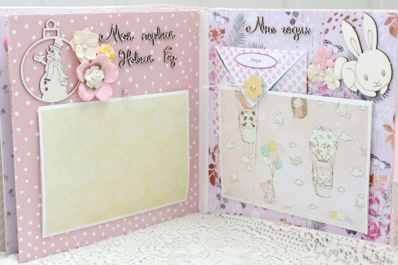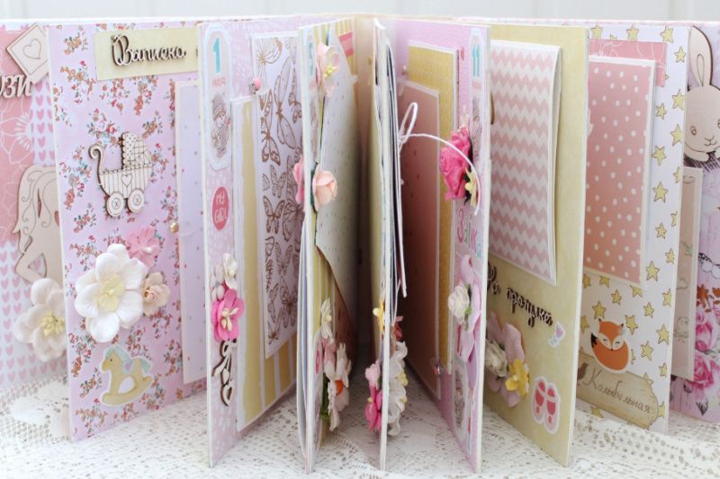 Очень объемный нежный альбом ручной работы для девочки. Формат альбома 20х20, внутри 16 декорированных тематических страниц, толщина альбома 10 см, рассчитан на 70 фотографий. Альбом выполнен по темам: Ангел под сердцем+УЗИ, Привет,Мир!конверт для бирочки, Выписка из роддома, Первое купание, Фотографии 1-12 месяцев, Моя семья (Мама, Папа,Братик), На прогулке, Любимая доченька, Сладкие сны , Мой первый Новый Год, Мне годик+конверт для локона.