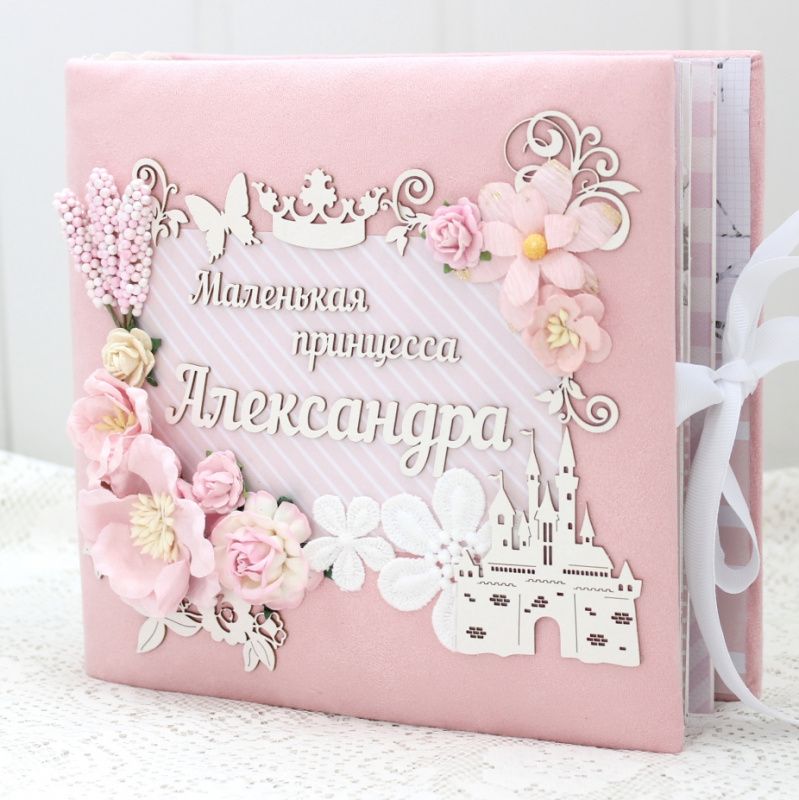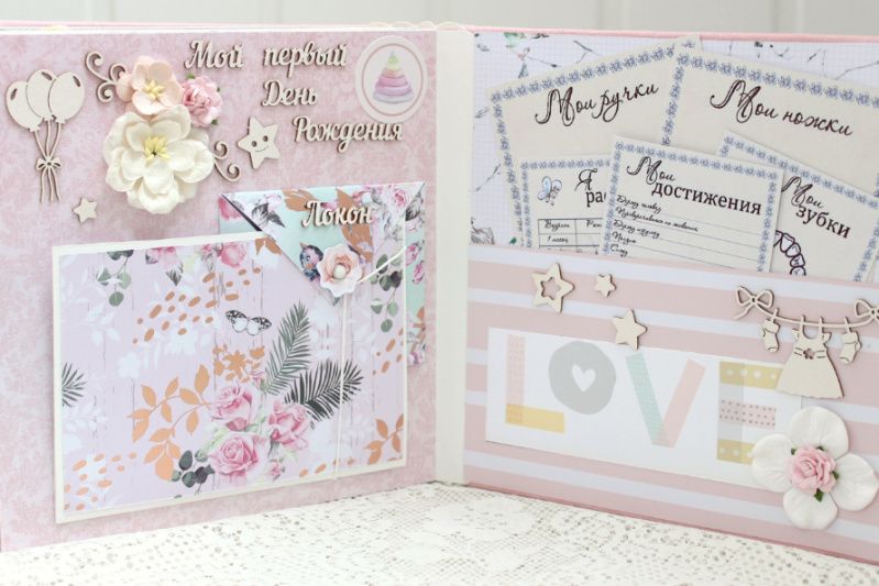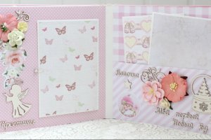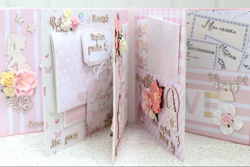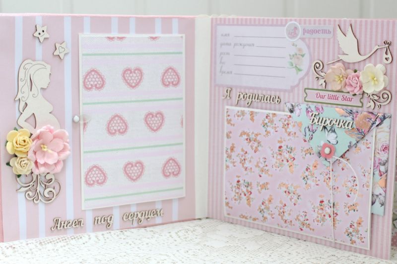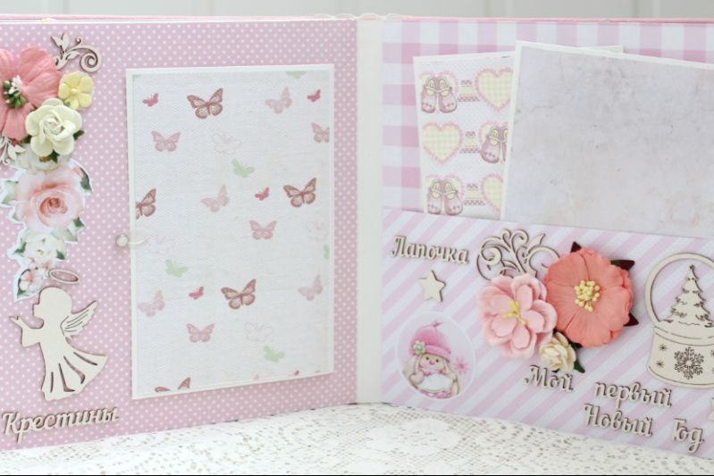 Альбом ручной работы для девочки. Формат альбома 20х20, внутри 8 декорированных тематических страниц, рассчитан до 50 фотографий. Альбом выполнен по темам: Ангел под сердцем, Я родилась+конверт для бирочки, Выписка, Первая улыбка, Мы дома, Купание, Сладкие сны, Крестины, Лапочка, Мой первый Новый Год, Мой первый День Рождения+конверт для локона, Таблицы роста и достижений ребенка.