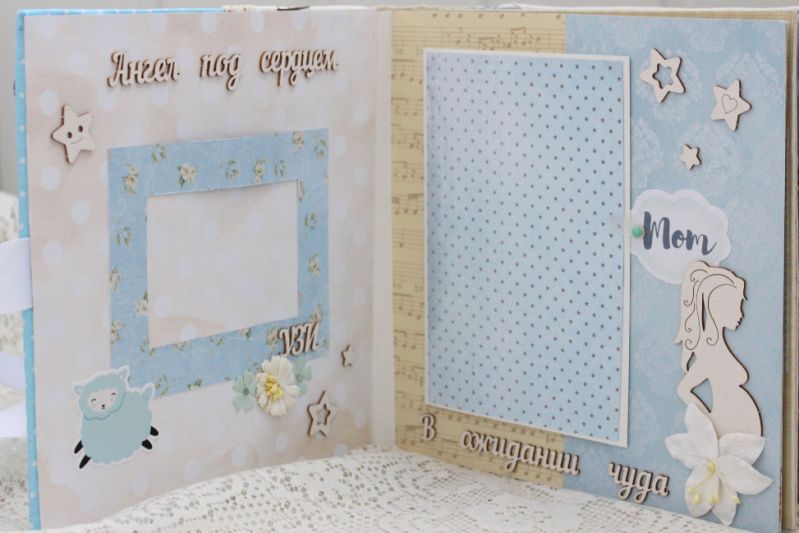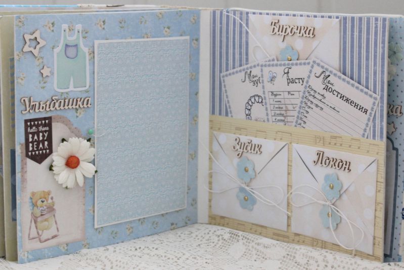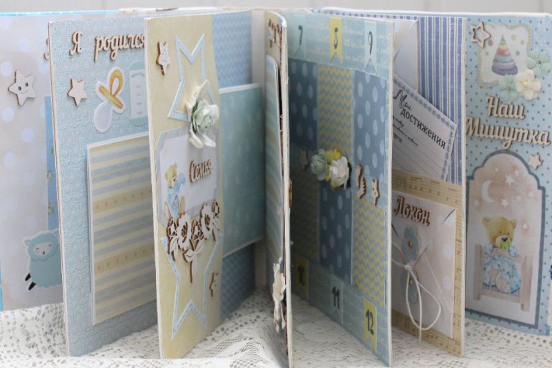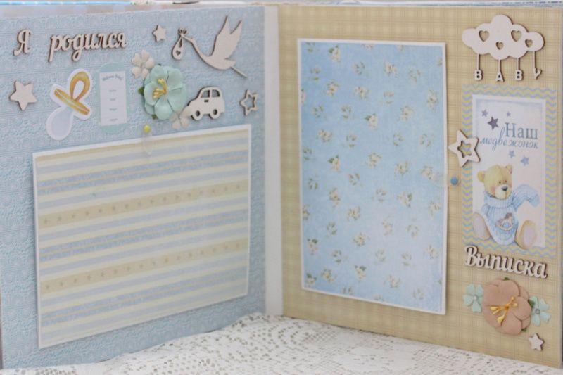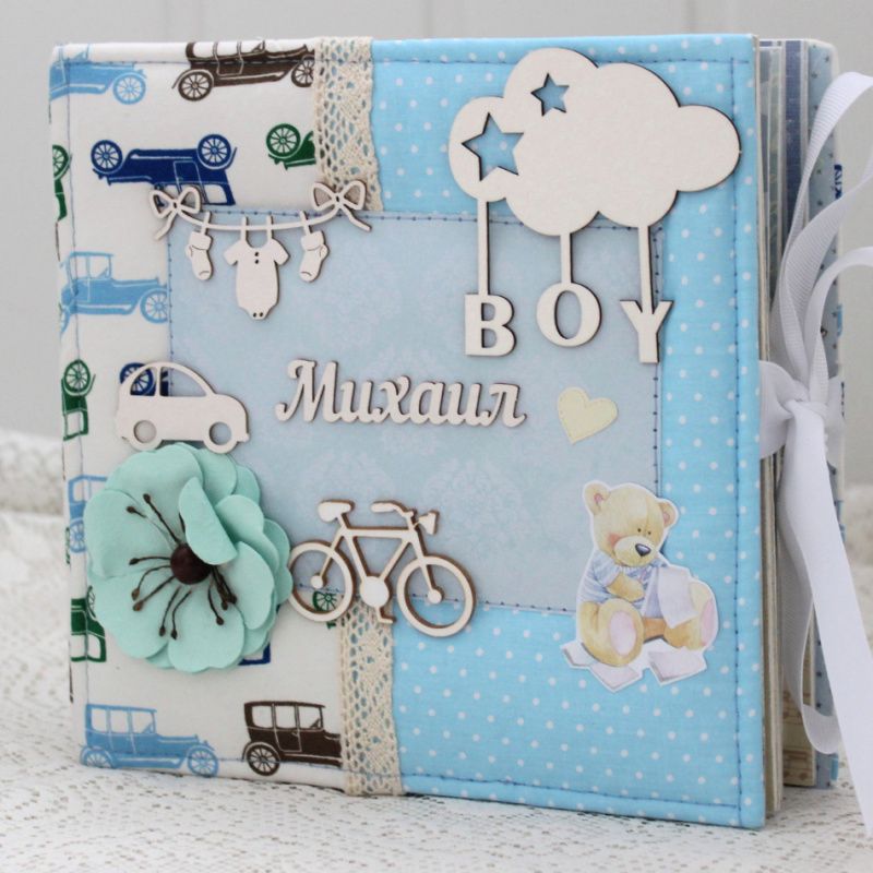 Скрап альбом для мальчика. Формат альбома 20х20, внутри 12 декорированных тематических страниц, рассчитан до 50 фотографий. Альбом выполнен по темам: Ангел под сердцем (УЗИ), В ожидании чуда, Я родился, Выписка, Семья, Первый Новый Год, Маленькие фотографии 1-12 месяцев, Улыбашка, Конверты для бирочки,локона и зубика, Таблицы роста и достижений ребенка, Мне 1 годик, Наш Мишутка.