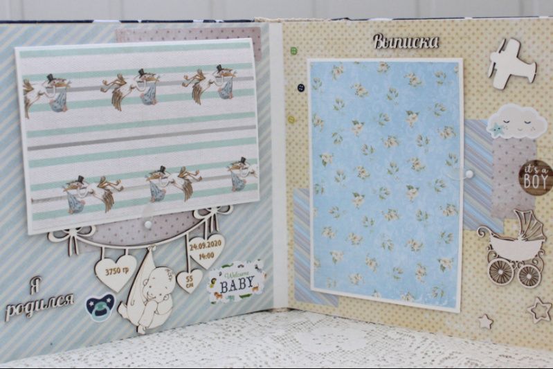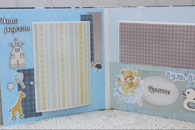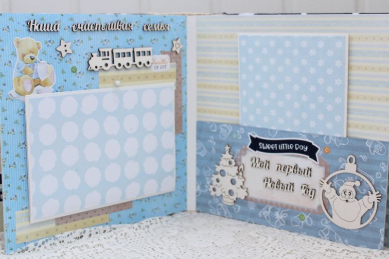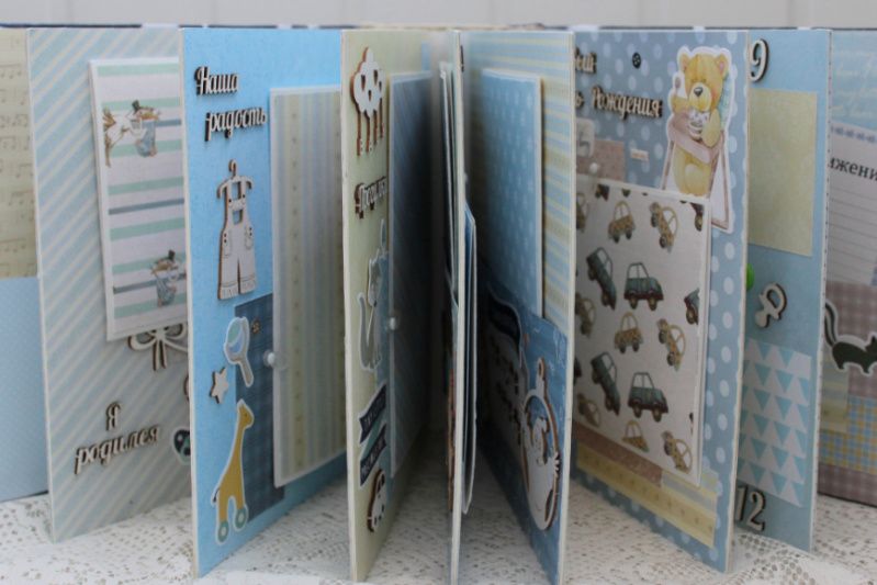 Очень объемный альбом ручной работы для мальчика. Формат альбома 20х20, внутри 16 декорированных тематических страниц, толщина альбома 10 см, рассчитан на 60 фотографий. Альбом выполнен по темам: Как мы узнали о том, что у нас появишься ты, В ожидании чудаУЗИ, Я родилсяметрика, Выписка, Наша радость, Купание, Прогулки , Крестины, Наша счастливая семья, Мой первый Новый Год, Первое слово, Мой первый День Рождения, Маленькие фотографии 1-12 месяцев, Конверты для бирочки, локона и зубика, Таблицы роста и достижений ребенка.