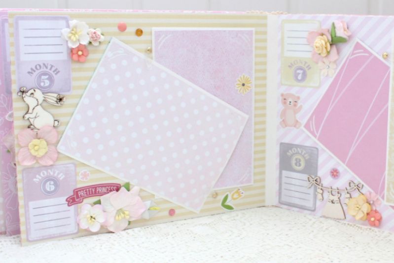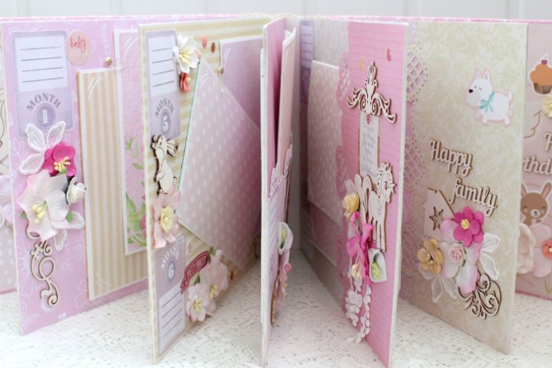 Большой фотоальбом ручной работы для девочки на первый годик жизни. Формат альбома 20х25. внутри 12 декорированных тематических страниц, рассчитан до 80 фотографий. Альбом выполнен на английском языке (на заказ возможно исполнение на любом языке). В альбоме имеются такие разделы: