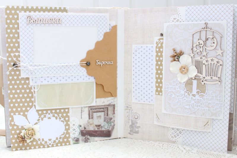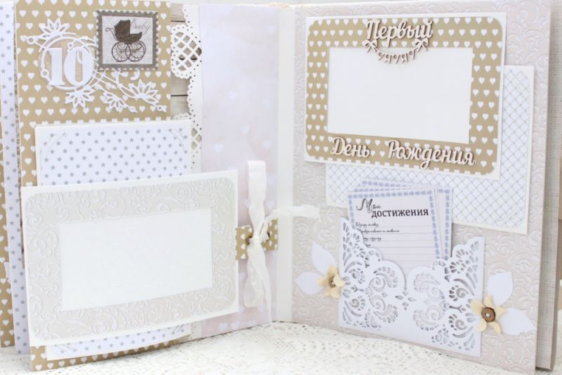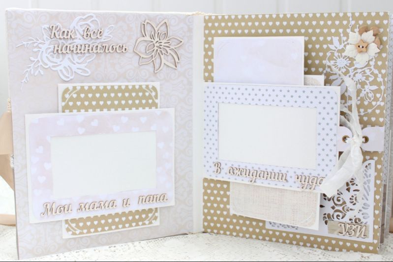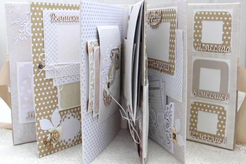 Детский альбом ручной работы для девочки с множеством различных конструкций, конвертов и кармашков (альбом сделан в универсальной цветовой гамме, такой же альбом можно сделать и для мальчика). Формат альбома 20х25, внутри 10 декорированных страниц, рассчитан до 70 фотографий. Альбом выполнен по темам: Как всё начиналось, Мои мама и папа, В ожидании чуда + Тест + УЗИ, Выписка + конверт для бирочки , Фотографии 1-12 месяцев , Крестины, Первый День Рождения, Таблицы роста и достижений ребенка, Маленький фотографии 1-12 месяцев.