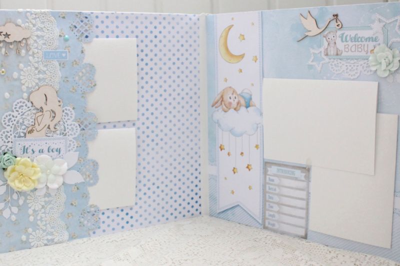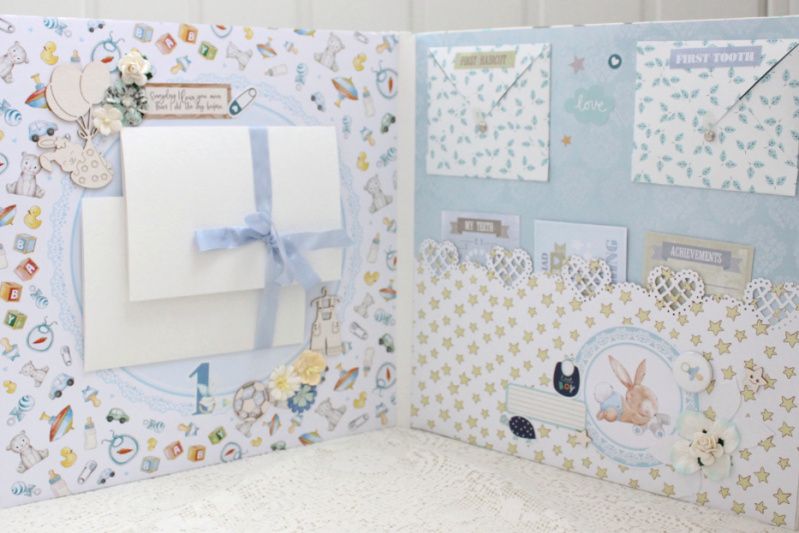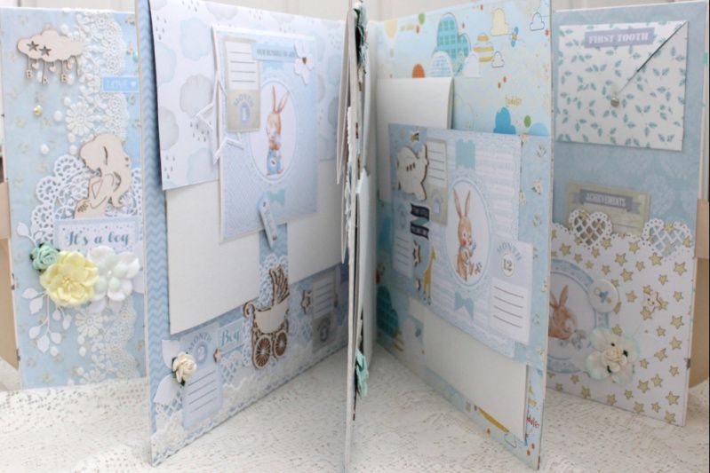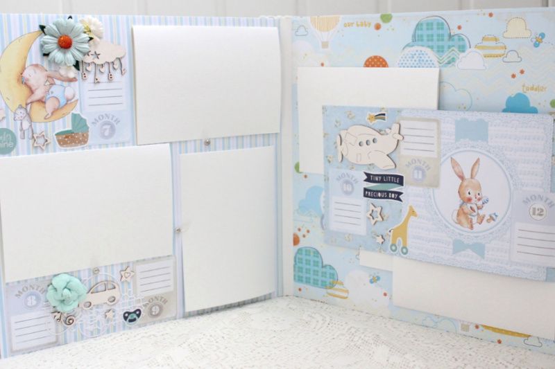 Большой альбом ручной работы для мальчика с множеством разнообразных украшений на каждой странице. Формат альбома 30х30, внутри 8 декорированных страниц, рассчитан на 82 фотографии. Альбом выполнен на английском языке от ожидания малыша до 1 года.