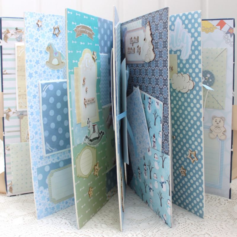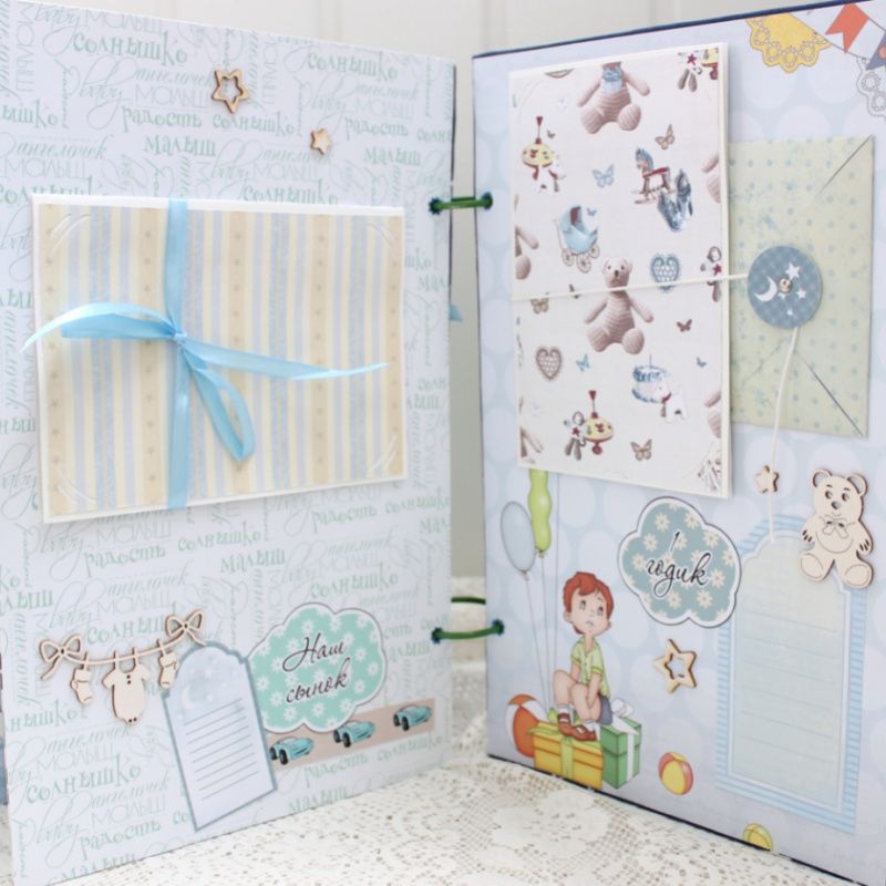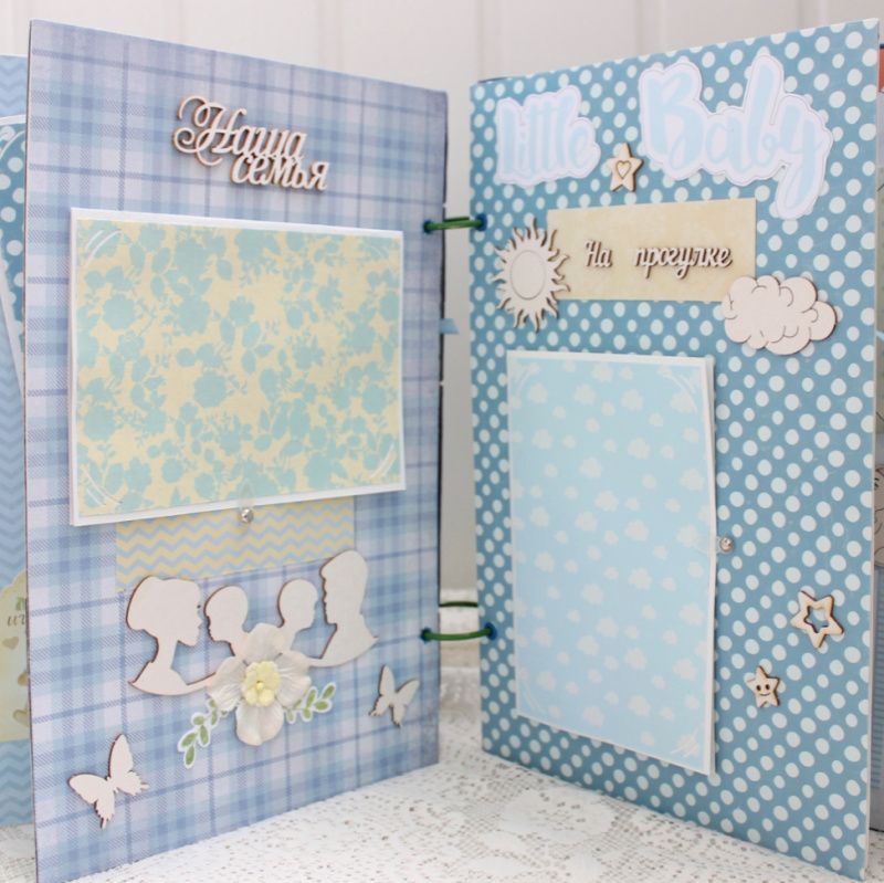 Большой альбом для малыша. Формат альбома 20х30, на кольцах, внутри 12 декорированных тематических страниц, рассчитан до 70 фотографий. Альбом выполнен по темам: Я родился, Наше лето, Волшебные сны, Купание, Я с братом, Время для игры, Первый Новый Год, Наша семья, На прогулке, Наш сынок, Мне 1 годик.