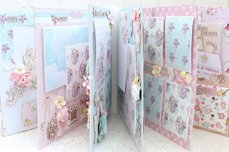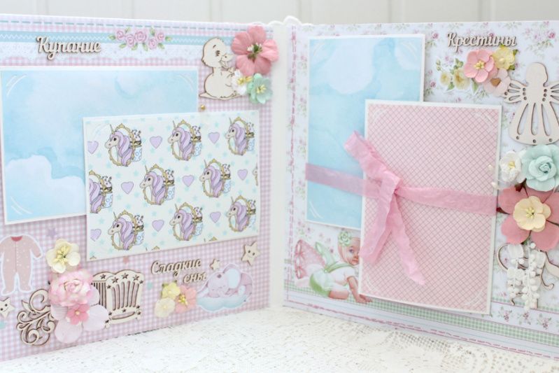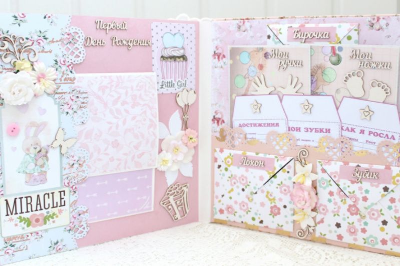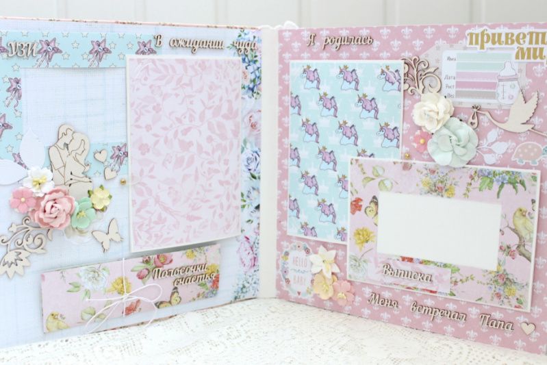 Большой альбом ручной работы для новорожденной девочки. Формат альбома 25х25, внутри 10 декорированных тематических страниц, рассчитан до 90 фотографий 10х15 и 7х9. Альбом выполнен по темам : В ожидании чуда + УЗИ+ конверт для теста, Я родилась, Выписка (Меня встречал Папа), Купание, Сладкие сны, Крестины, Счастливая семья, Первый Новый Год, Время игр, Я познаю мир, Маленькие фотографии 1-12 месяцев, Первый День Рождения, Конверты для бирочки, локона и зубика, Таблицы роста и достижений ребенка , открытки для отпечатков ручек и ножек.