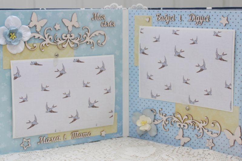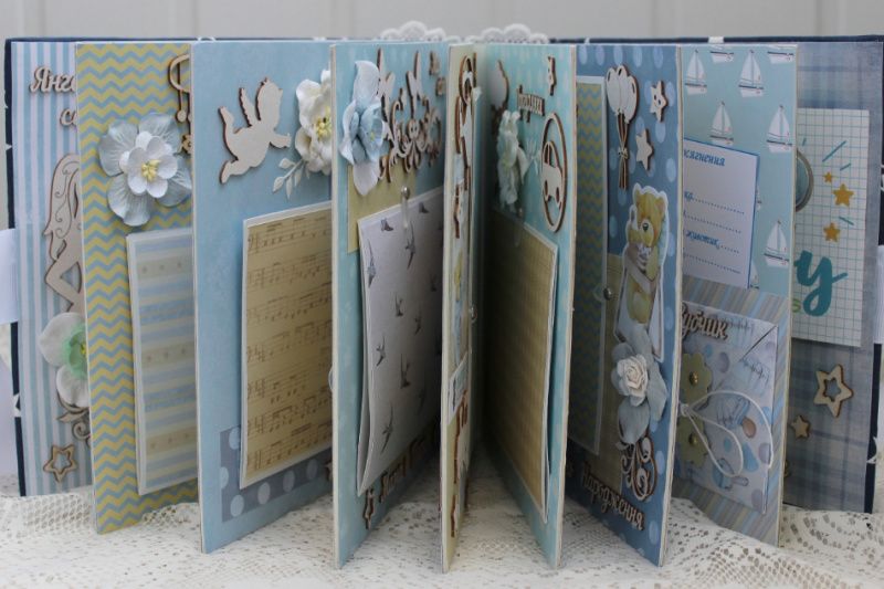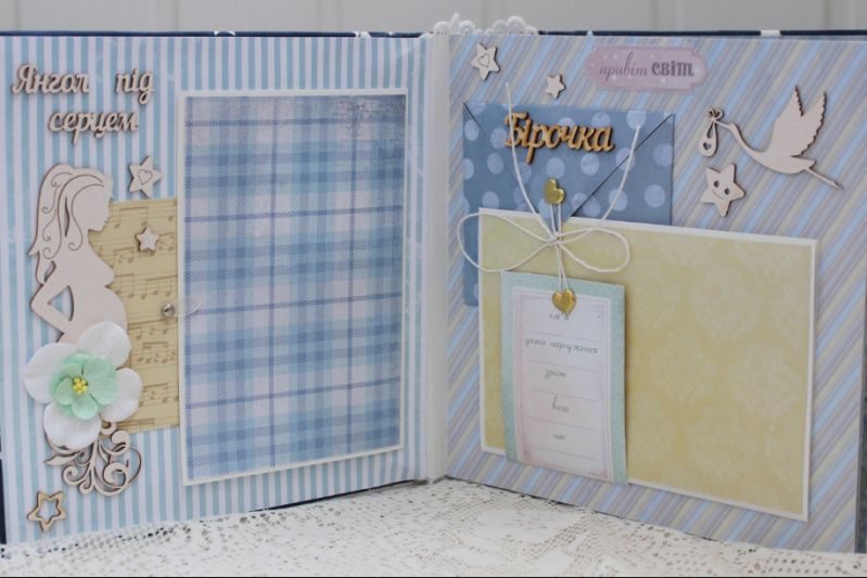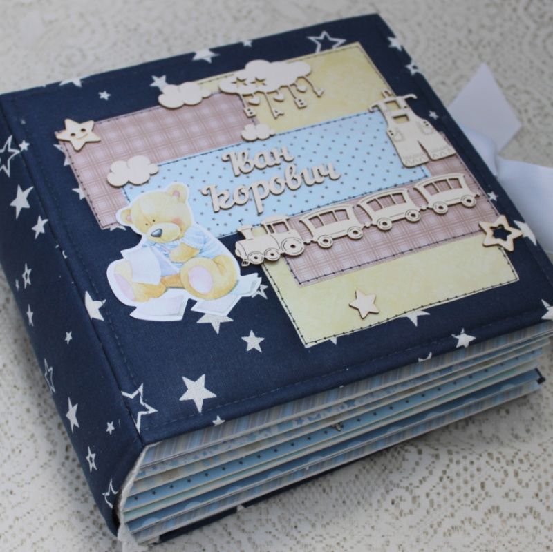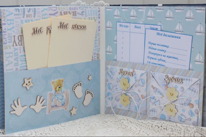 Большой объемный альбом ручной работы для мальчика. Формат альбома 20х20, внутри 12 декорированных тематических страниц, толщина 9 см, рассчитан до 70 фотографий. Альбом выполнен на украинском язике, внутри такие теме: Ангел под сердцем, Привет, Мир + конверт для бирочки Первое купание, Сладкие сны, Крестины, Наш малыш, Моя семья Мама и Папа, Бабушки и Дедушки, Мои игрушки, Прогулки , Первый Новый Год, Первый День Рождения, Конверты для локона и зубика, Таблицы роста и достижений ребенка, Карты для отпечатков ручек и ножек Детский сад, Первый раз в 1 класс.