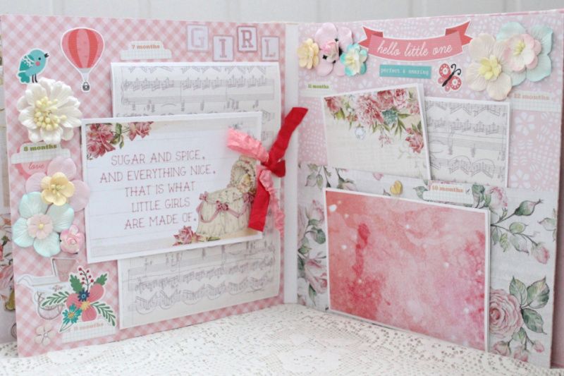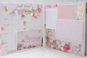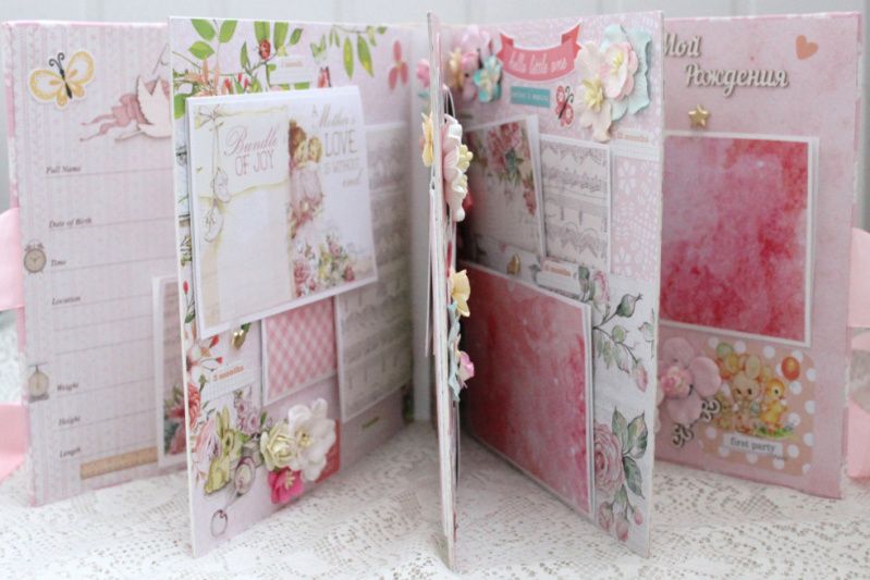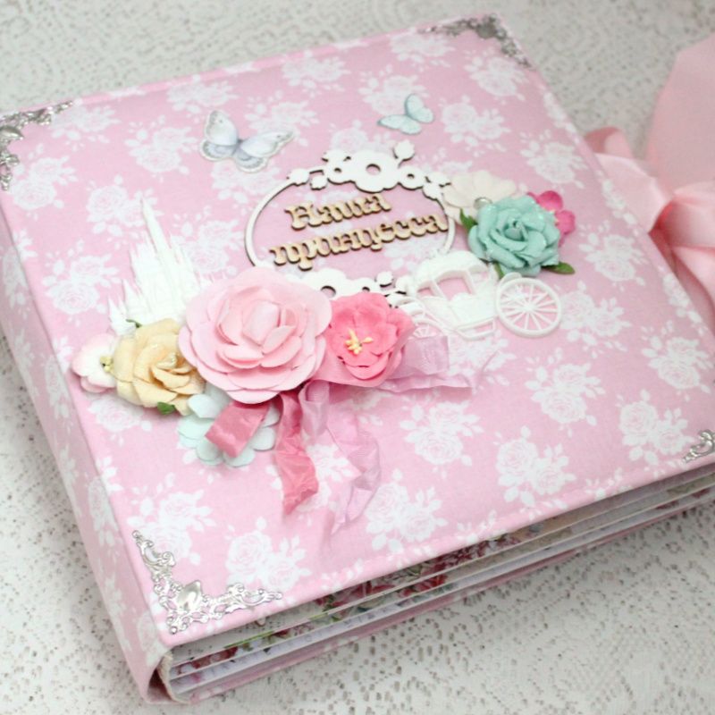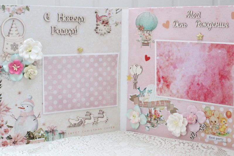 Большой альбом ручной работы для девочки. Формат альбома 25х25, внутри 8 декорированных страниц, рассчитан до 80 фотографий. Альбом выполнен по темам: Рождение малышки, Крошка, фотографии 1-12 месяцев, Новый Год, День Рождения.