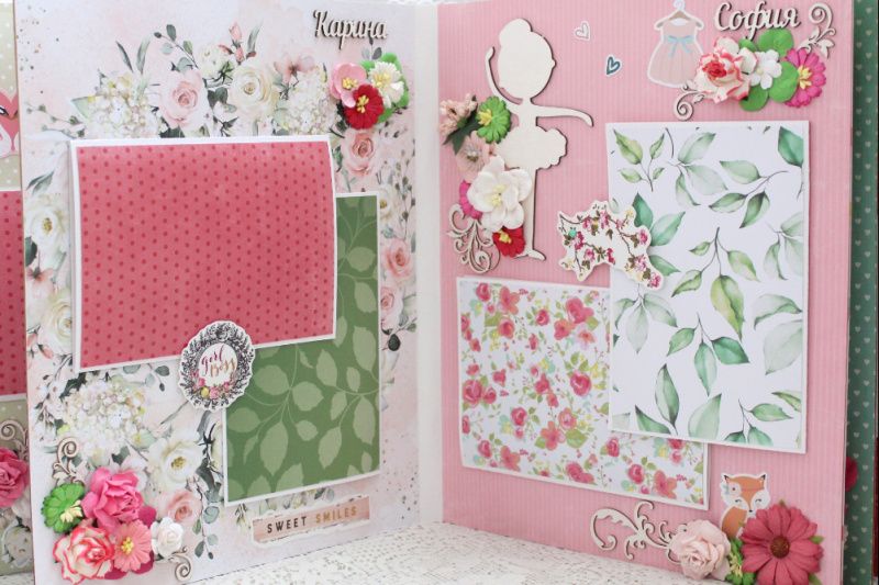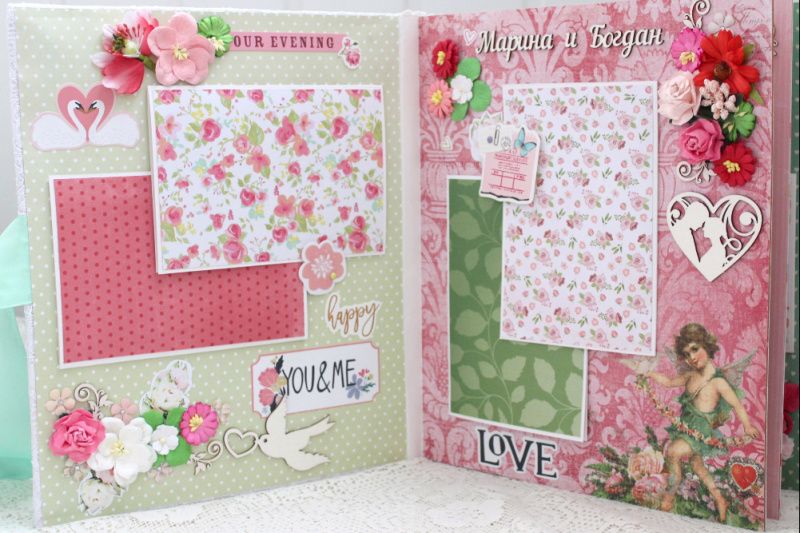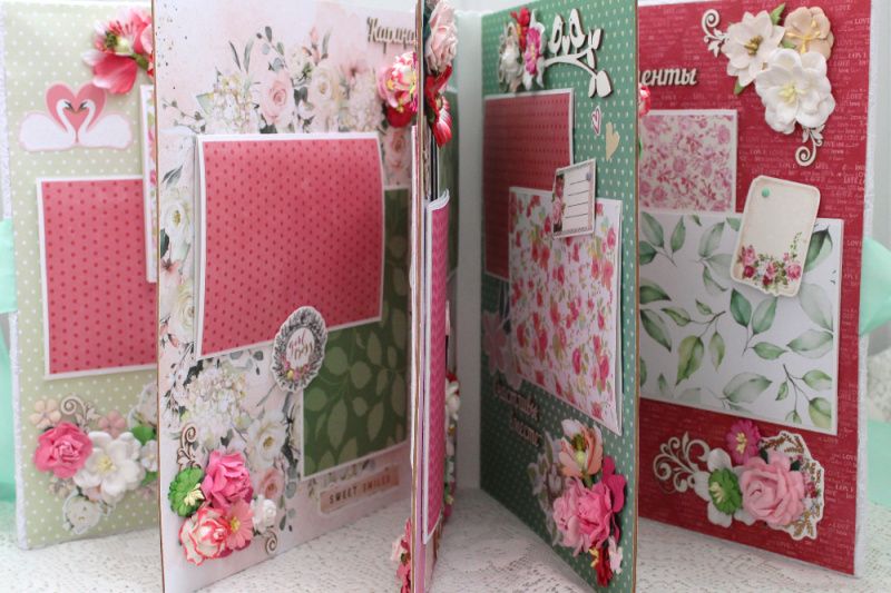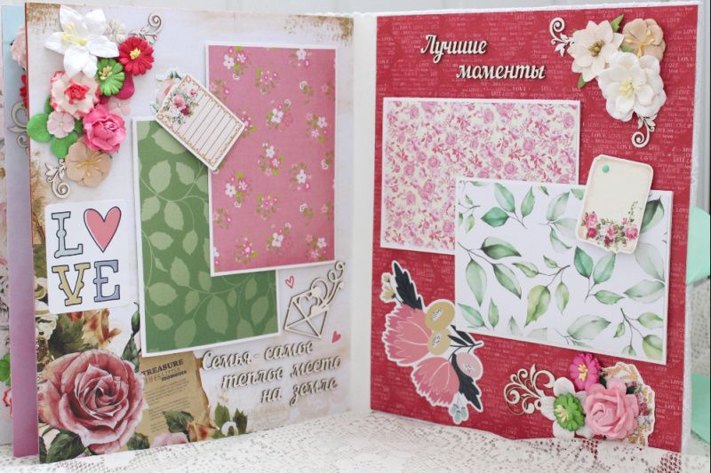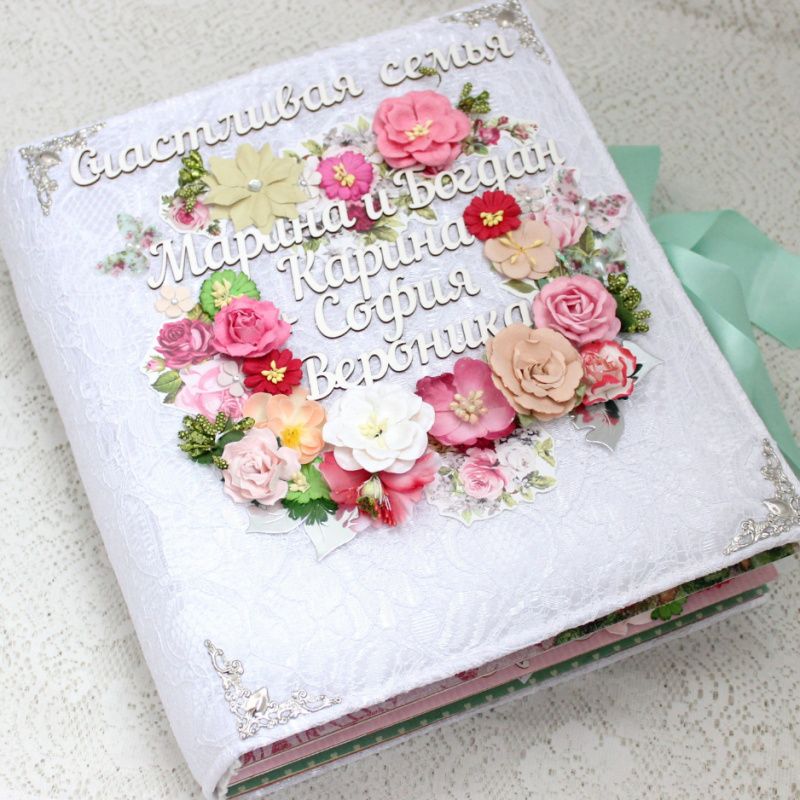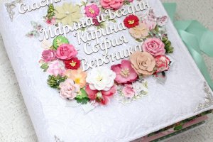 Большой семейный скрапальбом с множеством объемных цветочных композиций и различных украшений на каждой странице. Формат альбома 25х30, внутри 8 декорированных страниц, рассчитан до 80 фотографий. Альбом выполнен по темам: История любви , родители Марина и Богдан, Дети : Карина, София, Вероника , Счастливы вместе, Семья-самое теплое место на земле, Лучшие моменты . Все надписи делаются индивидуально.