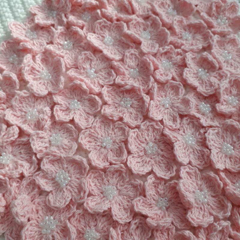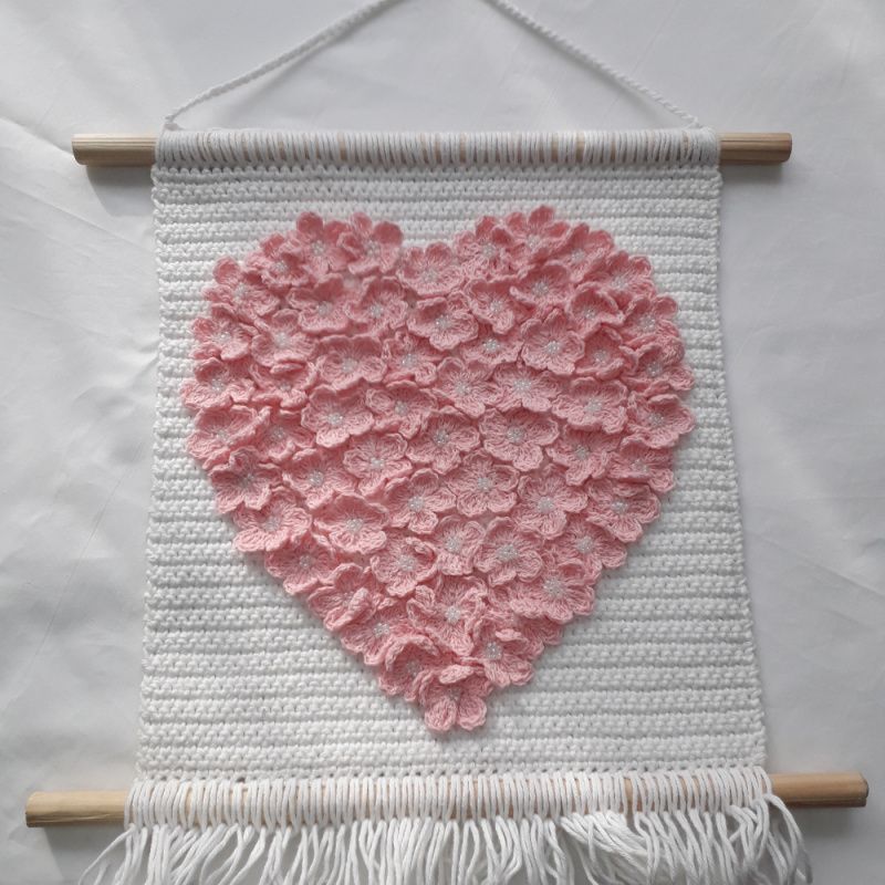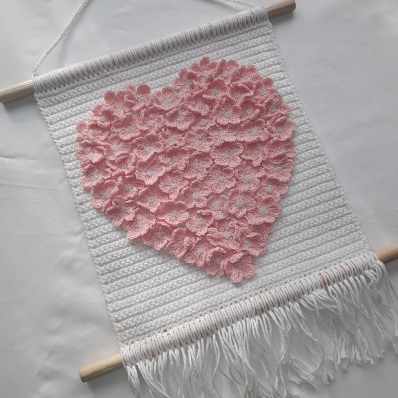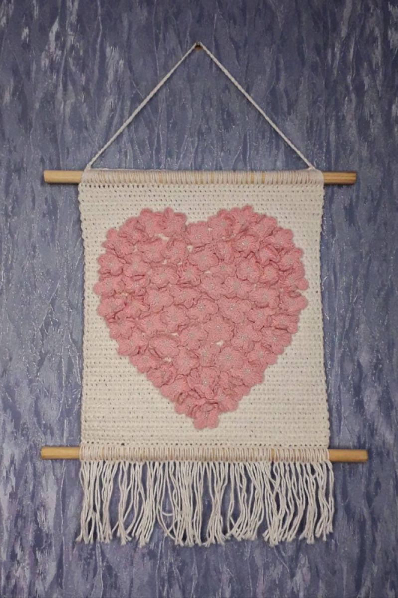 Настенное панно в форме сердца из нежно-розовых цветов. Связано крючком из 100% хлопка.