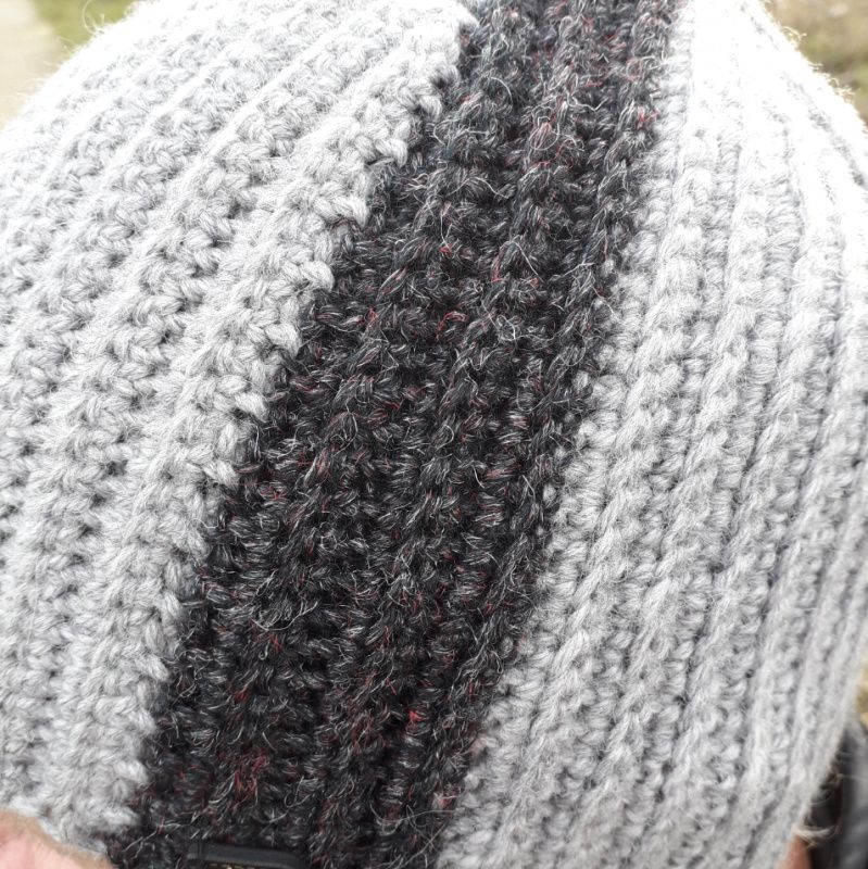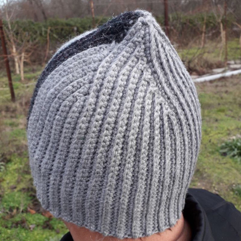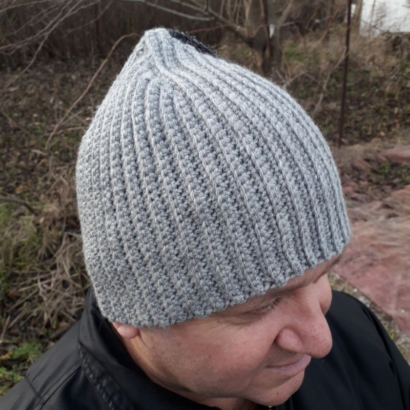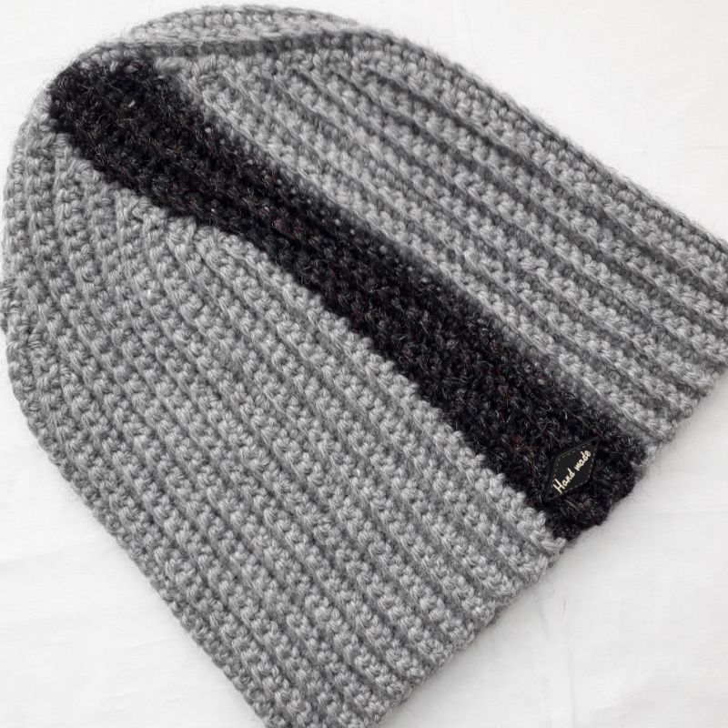 Мужская шапка вязаная крючком с полосой. Хорошо тянется. Приятная на ощупь.