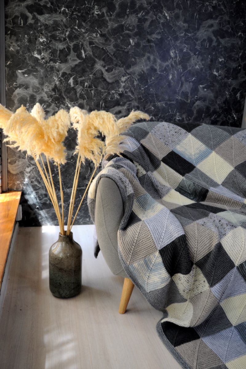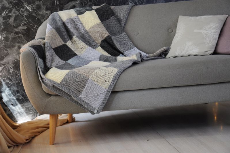 В составе пряжа разной фактуры. Что позволяет пледу хорошо держать форму квадратов.