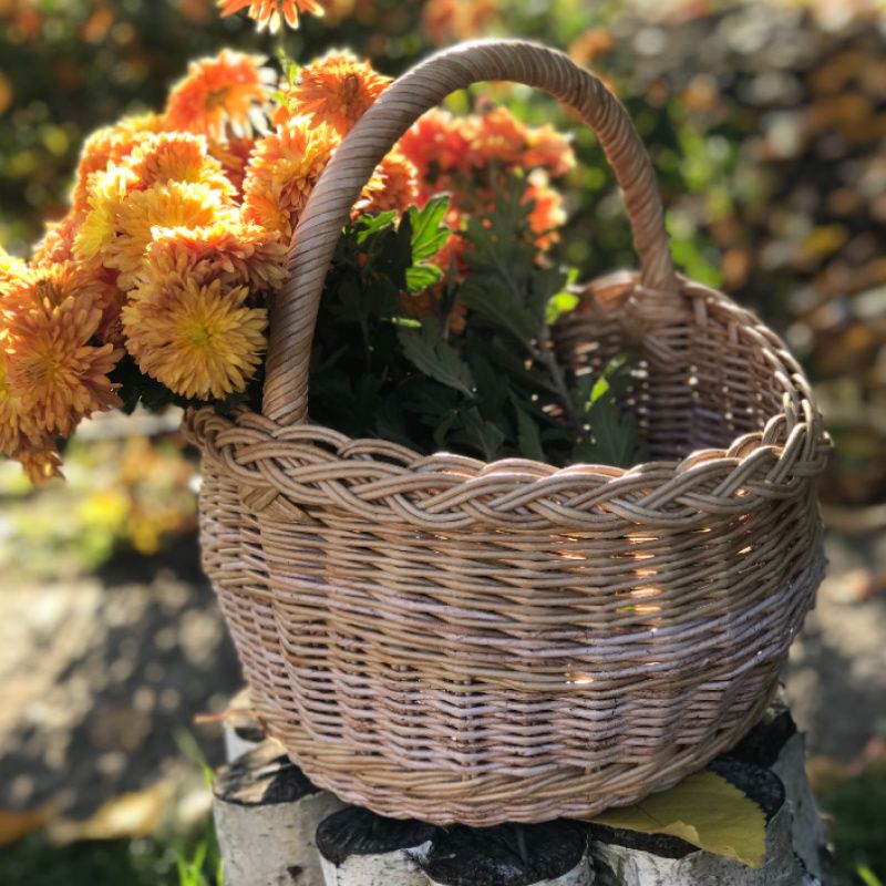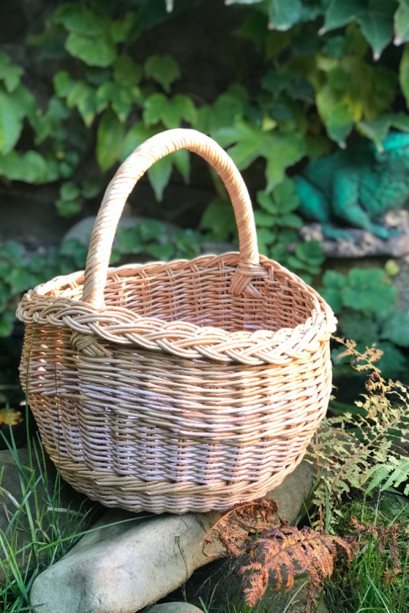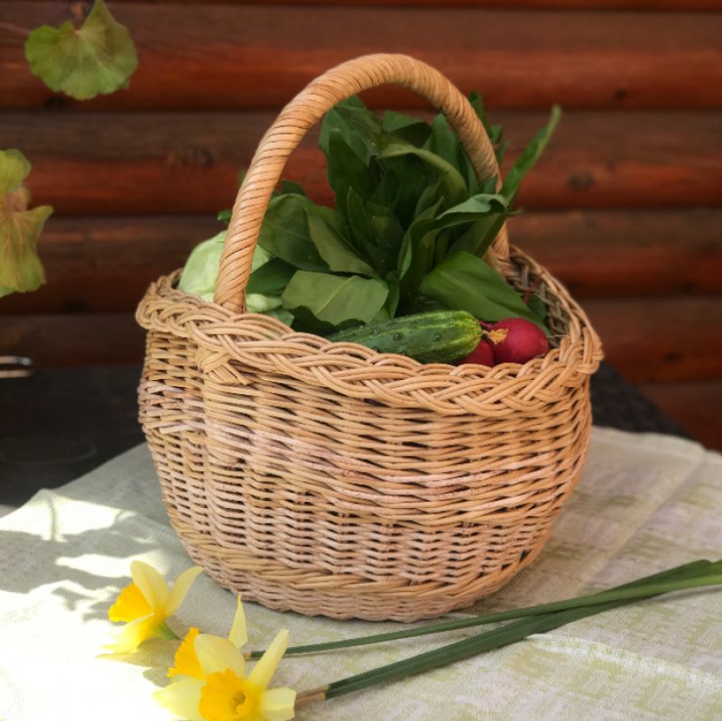 Эффектная, удобная, вместительная и прочная корзина ручной работы, выдерживает не менее 5 кг веса благодаря надёжному креплению ручки . Может использоваться в быту, для походов на рынок за продуктами, для фотосессий на природе, как пасхальная корзина. Плетение обработано пропитками и лаком на водной основе, изделие экологичное и не боится воды. Размеры- вверху диаметр 30, донышко - 22 см, высота корзины 19 см, с ручкой - 32 см.