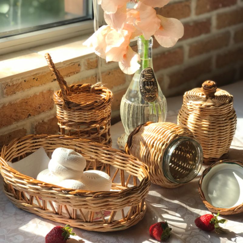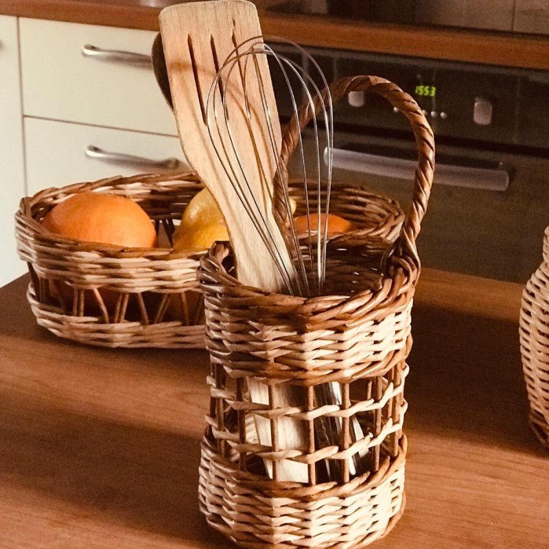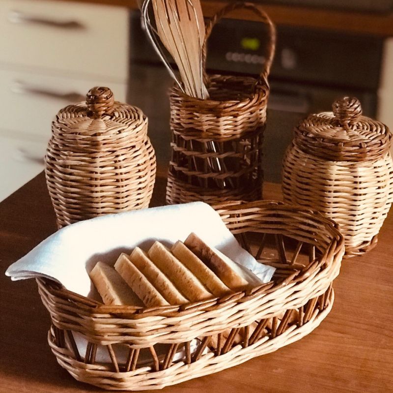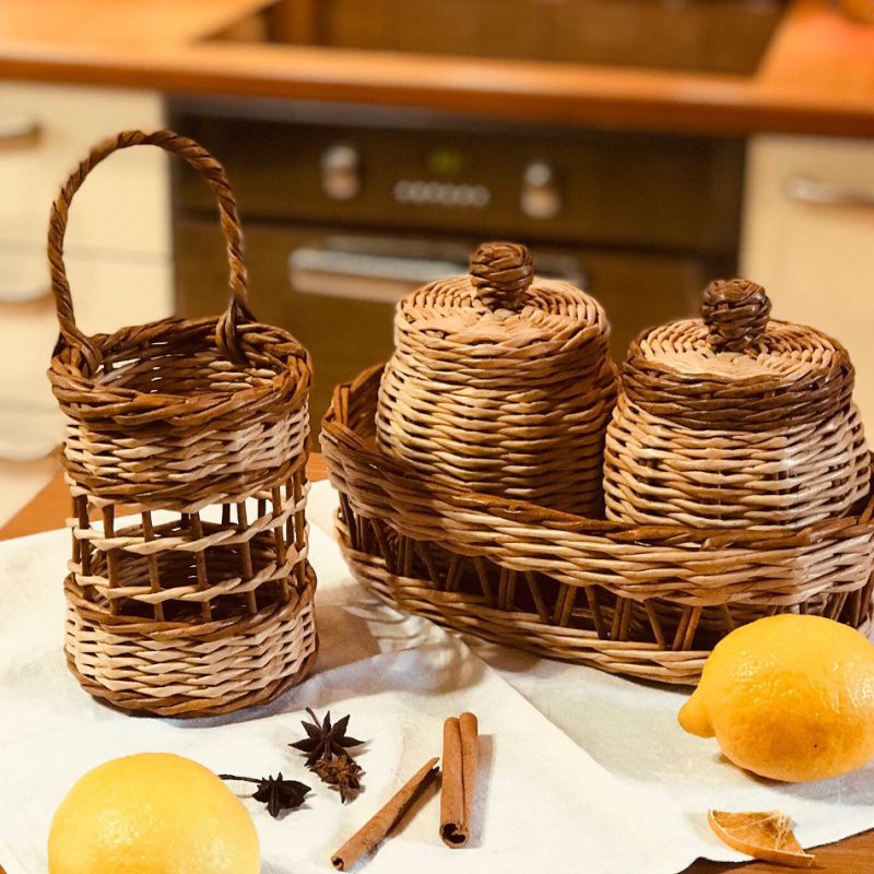 Состав набора: Баночки для кофе-чая-сахара, подвесная корзинка для кухонных приманок, корзинка для подачи хлеба. Все можно приобрести отдельно или дозаказать еще что угодно.